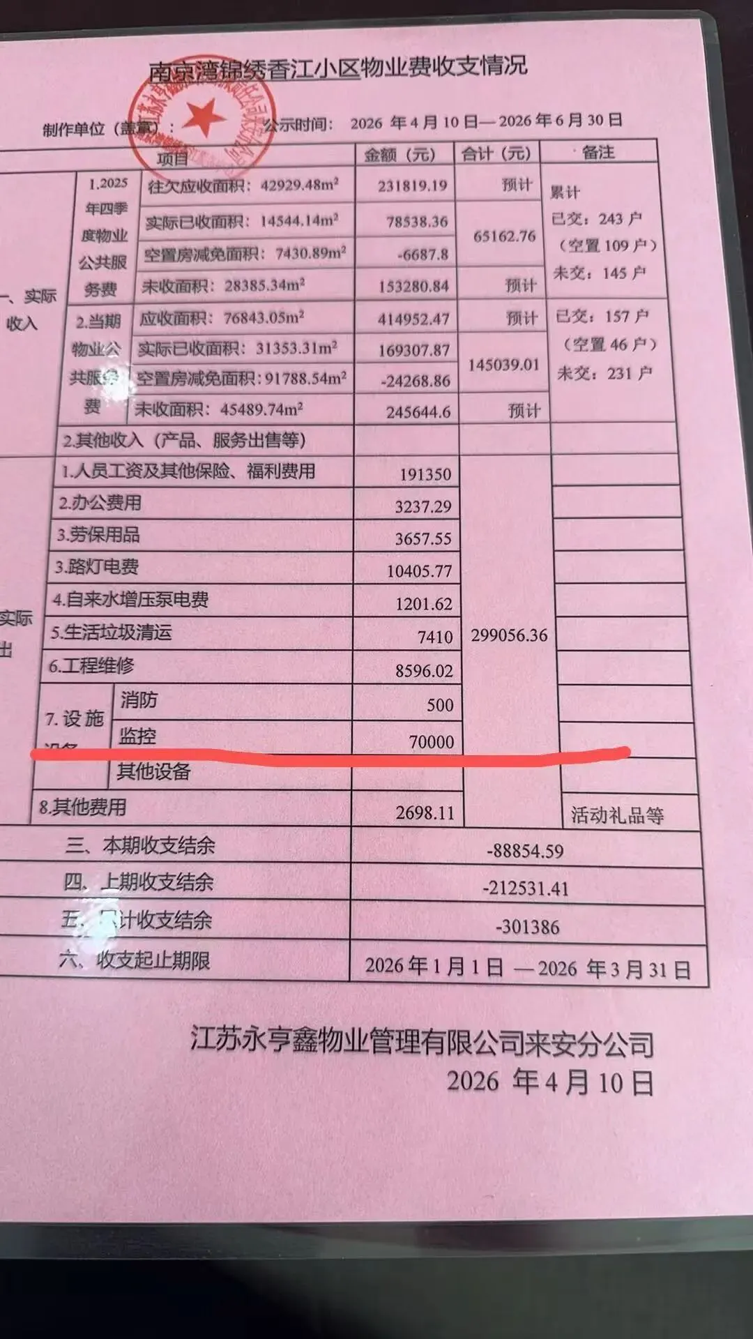 随后,【业委会成员1】贴出永亨鑫物业的《南京湾锦绣香江小区物业费收支情况》,见下图: