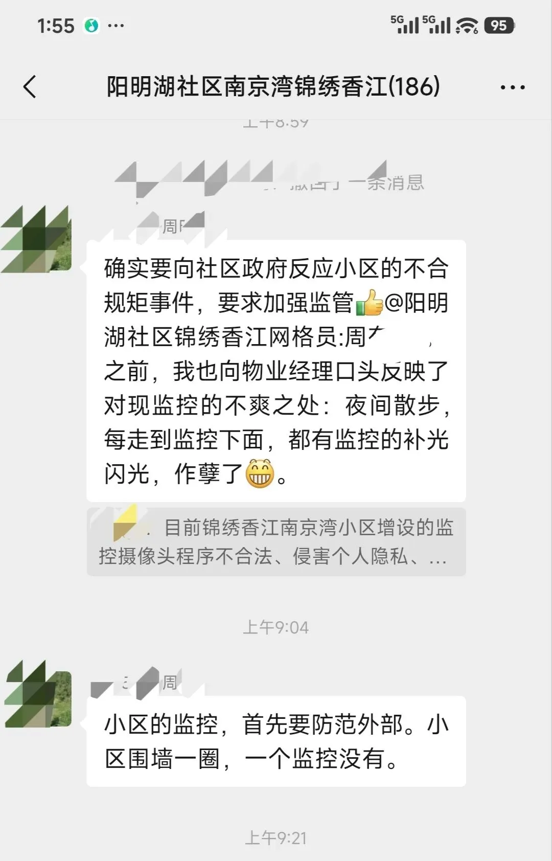 4月11号,有业主在社区群提出:小区监控,首先要防范外部。见下图: