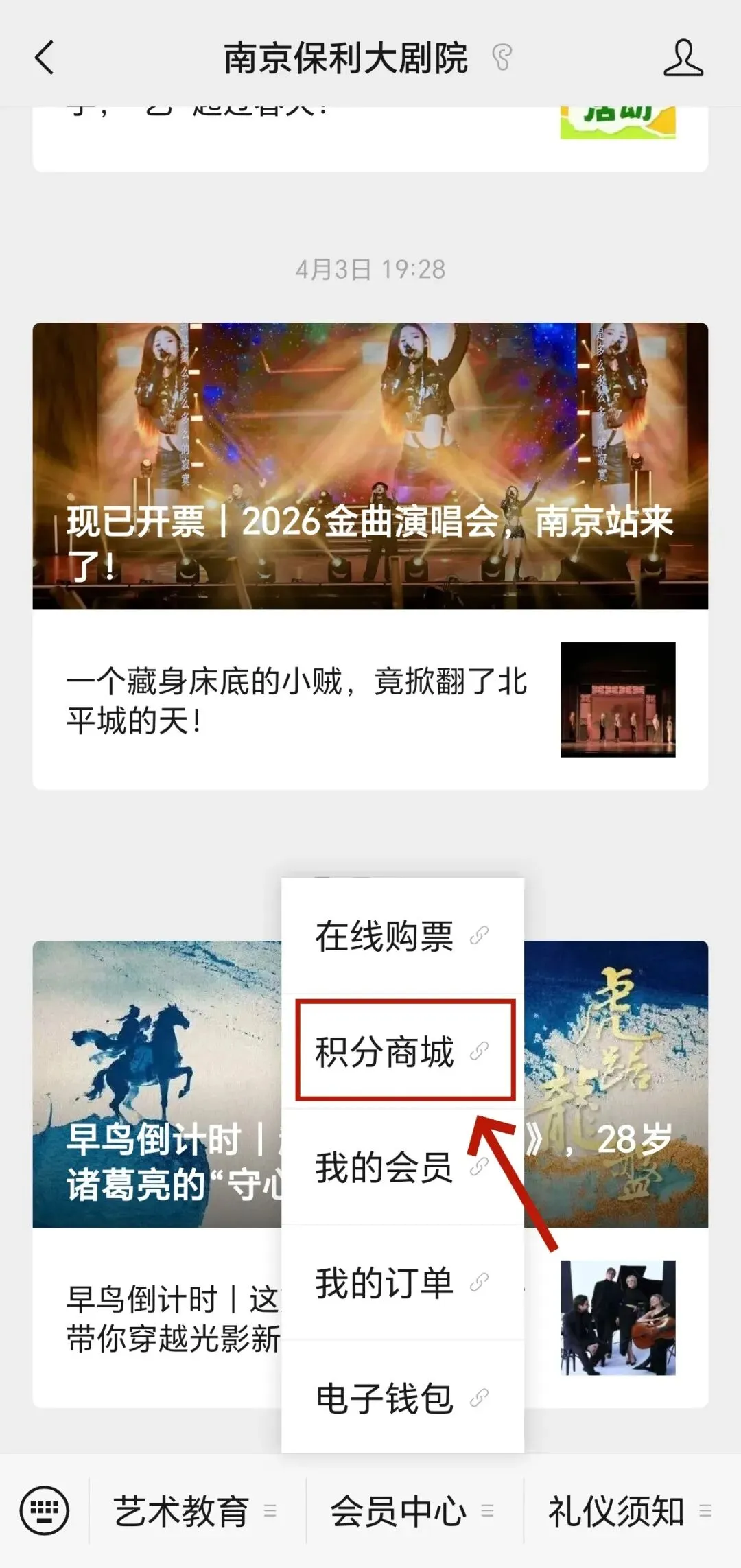 打开“南京保利大剧院”微信公众号,选择栏目“会员中心”—“积分商城”,点击进入子页面。