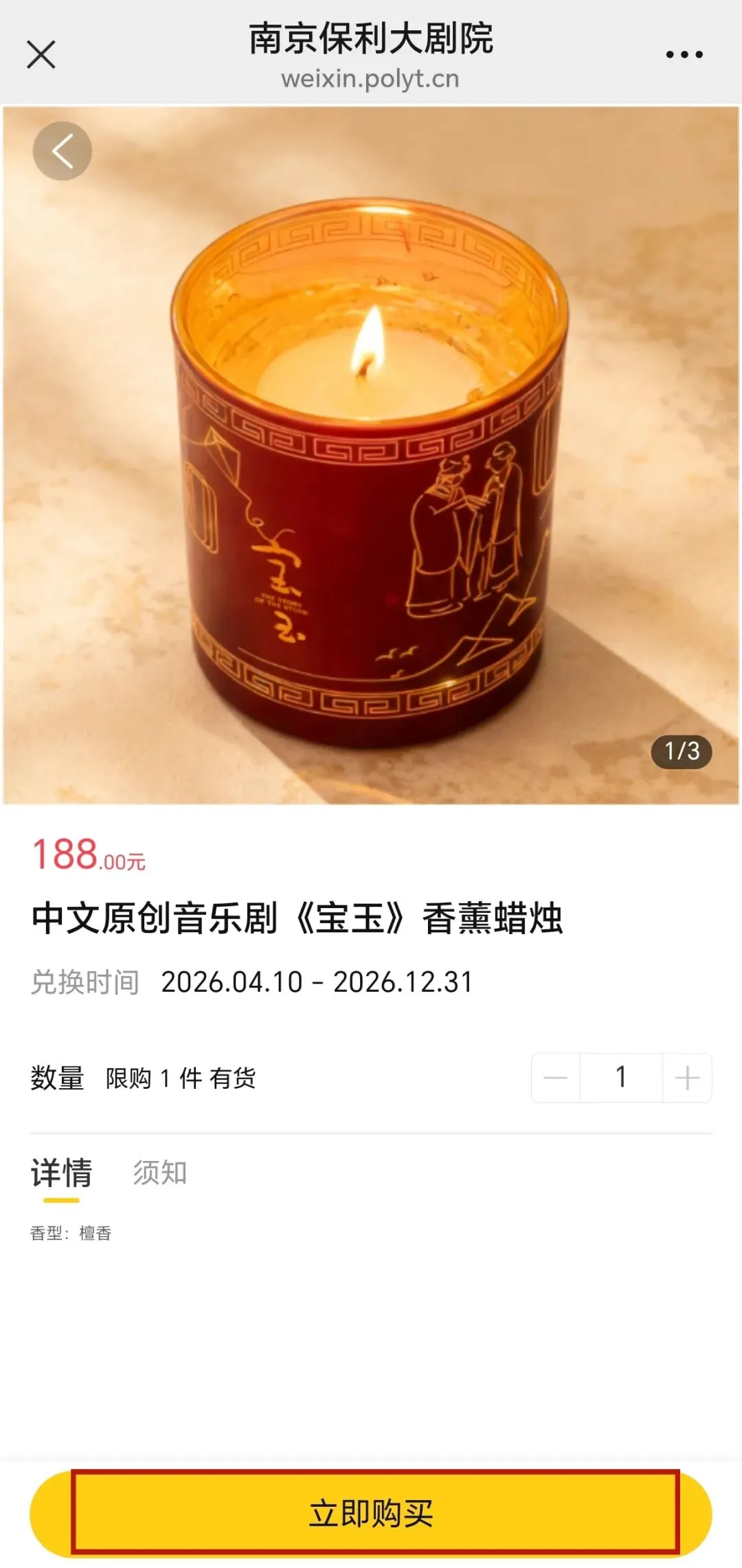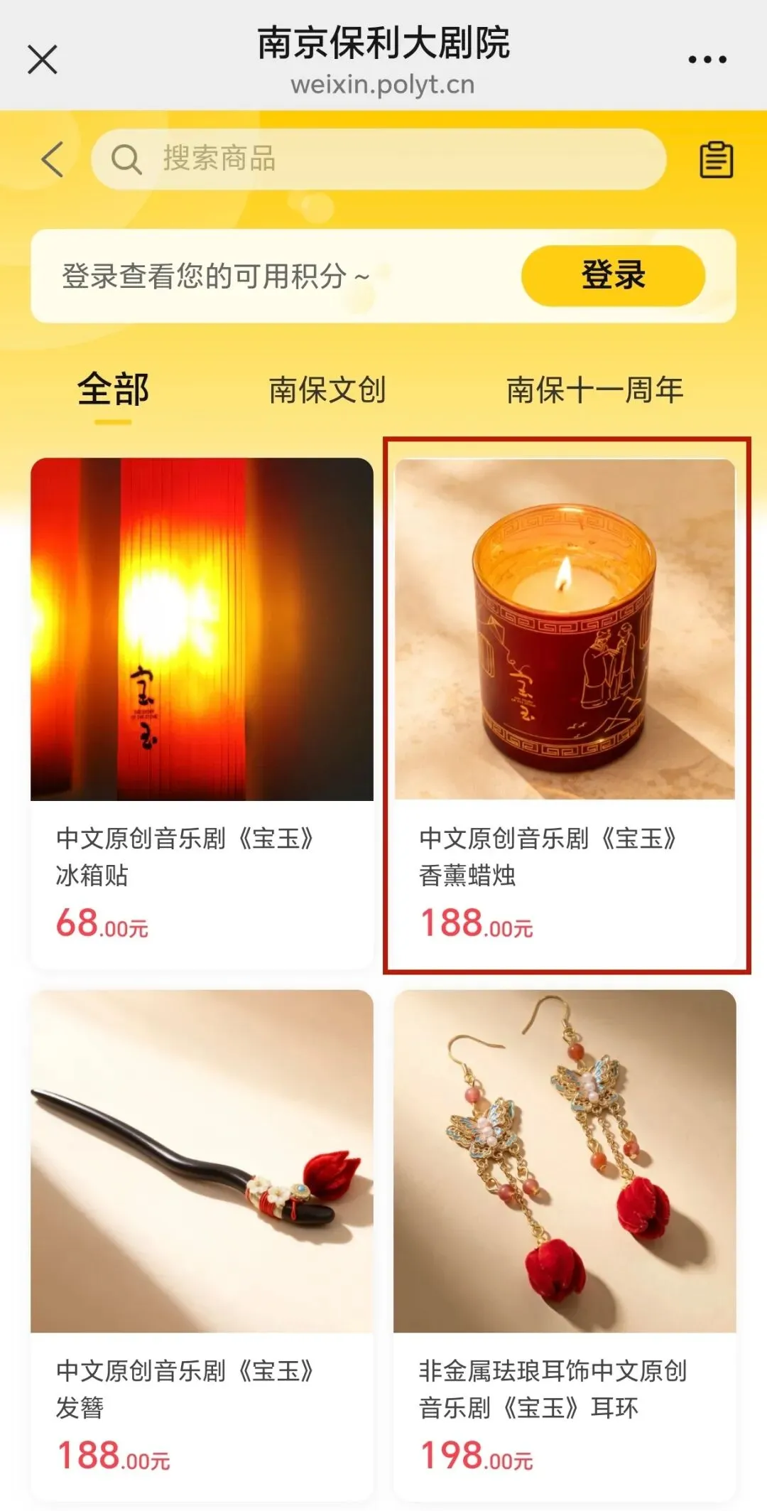 进入页面,在“全部商品”中,选择心仪的兑换商品,如:“中文原创音乐剧《宝玉》香薰蜡烛”。