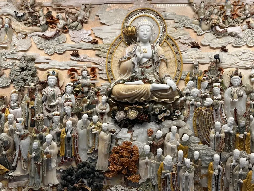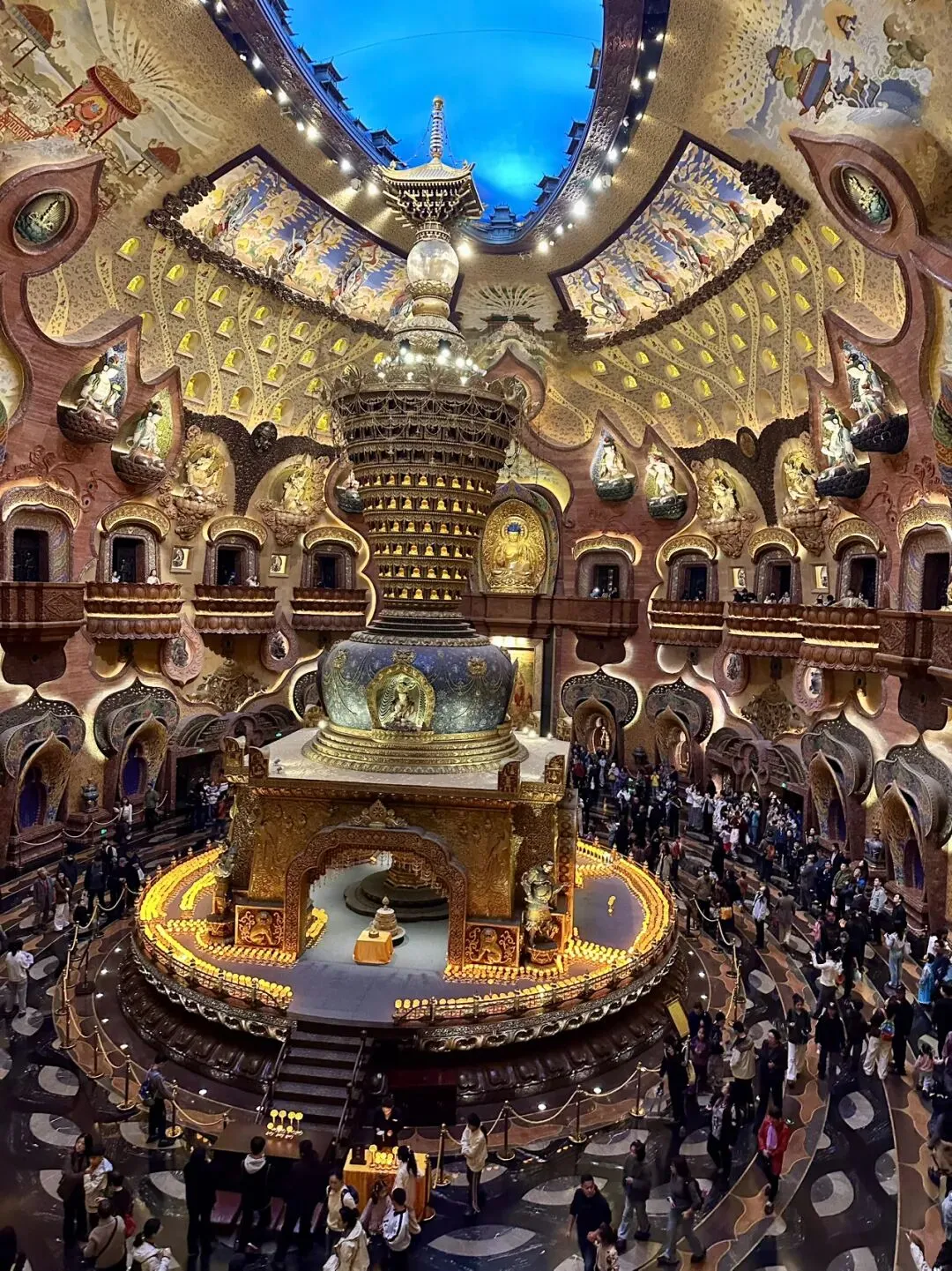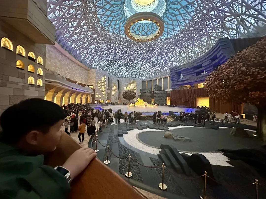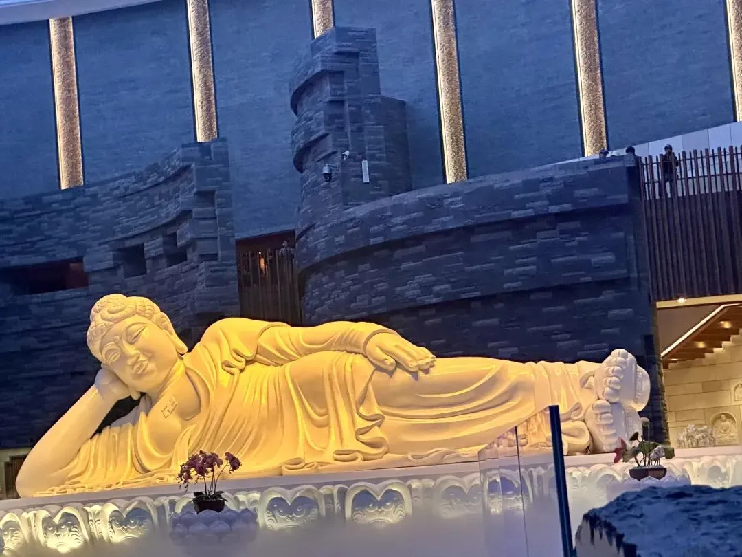 踏入佛顶宫,首先要看的是禅境大观中央的释迦牟尼涅槃卧像。这尊7.5米长的卧佛安详地侧卧于莲花台上,360度缓缓旋转,在光影变幻中诉说着生命的宁静与圆满。