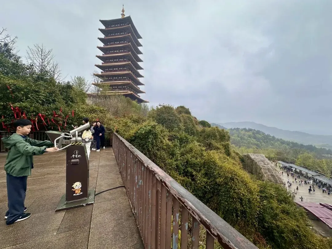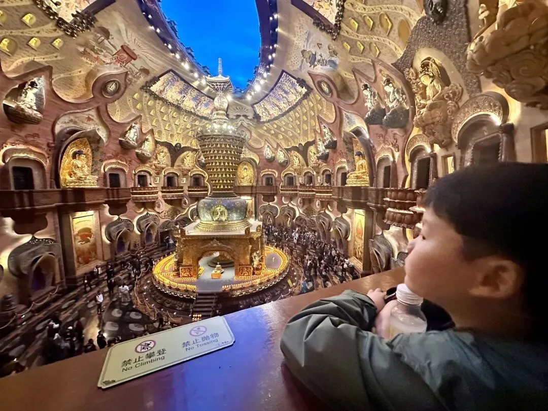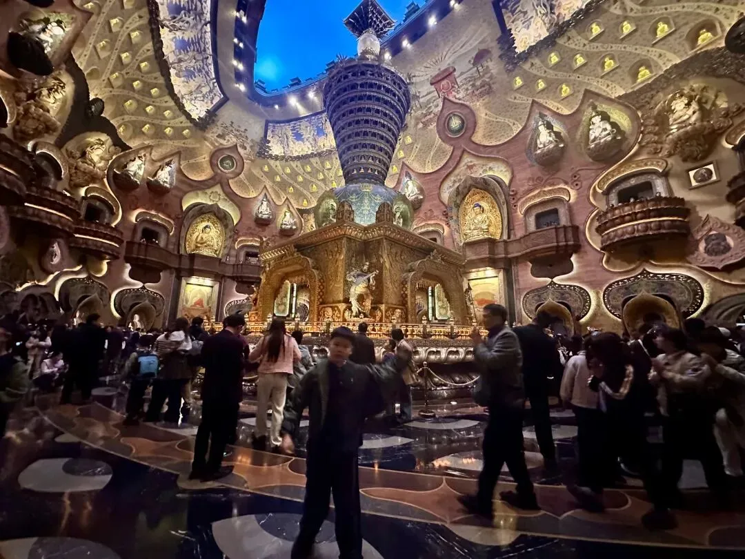 从山下乘坐电梯到达景区核心区,佛顶宫便以其独特的“榴莲”造型映入眼帘。这座深达数十米的建筑,外表虽引人争议,内里却极尽华丽与神圣,是无数人镜头下的焦点。
