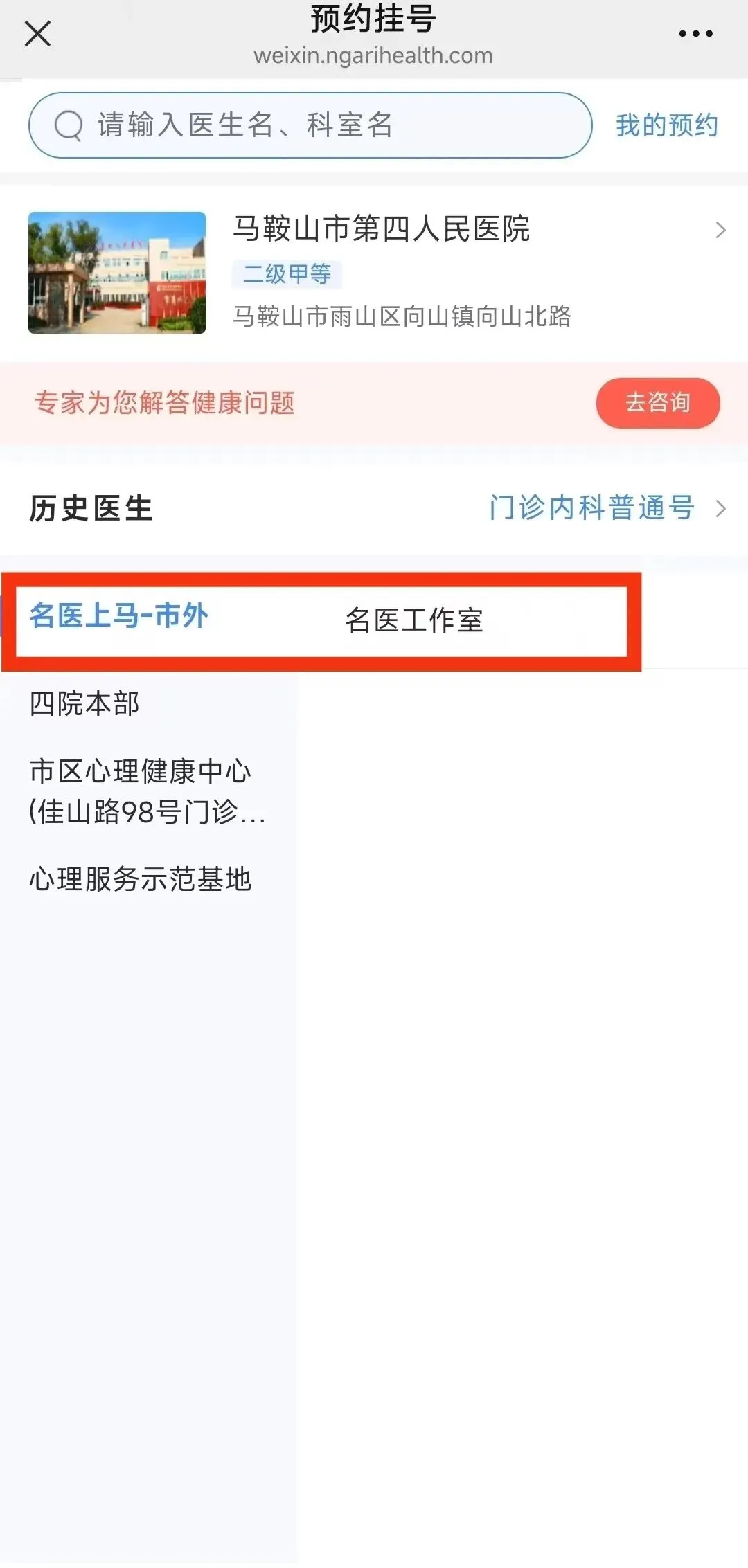 2.点击就医服务--预约挂号--选择名医上马-市外--选择名医工作室--选择医生--注册/登录--提交预约。