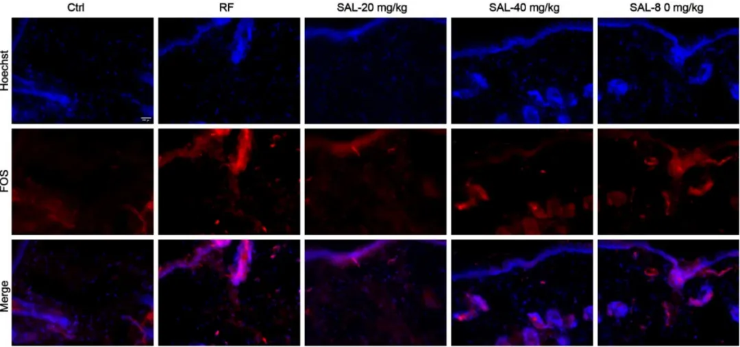 真皮是皮肤最厚的一层,会随着年龄增长而变薄。与载体对照组相比,给予40和80 mg/kg剂量的红景天苷可显著增加真皮厚度。具体来说,SAL-40 mg/kg 组和 SAL-80 mg/kg 组的真皮厚度分别增加了 24.49% 和 31.14%。