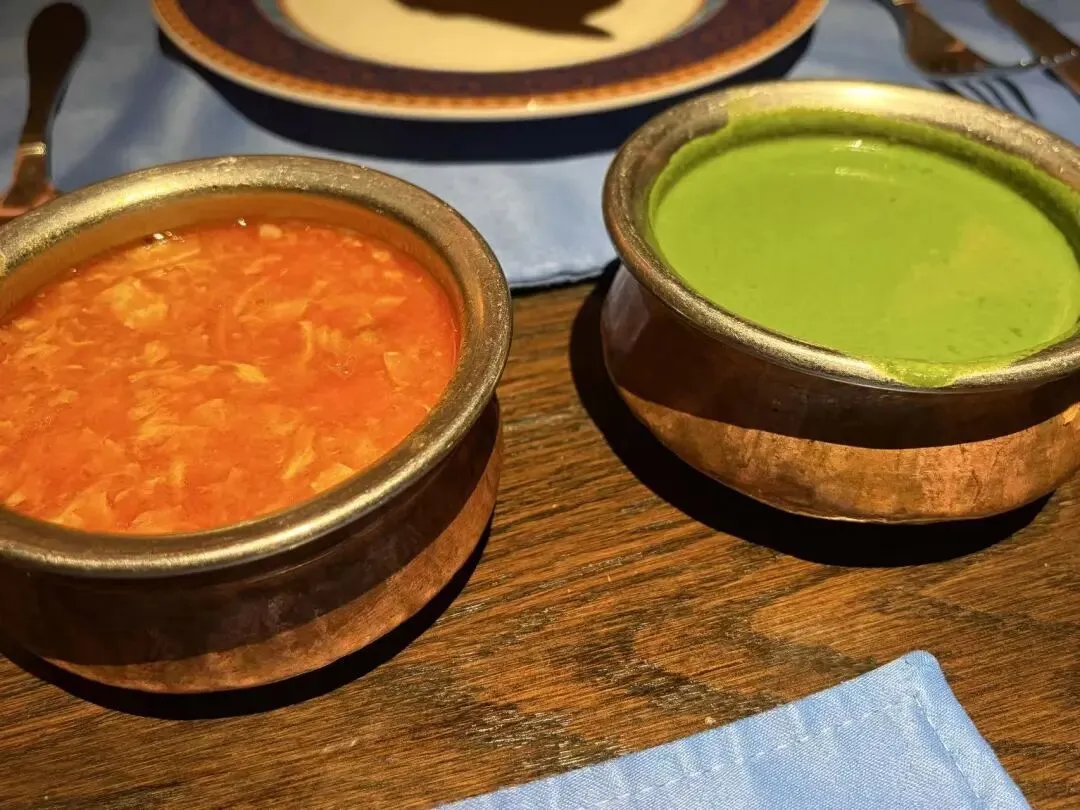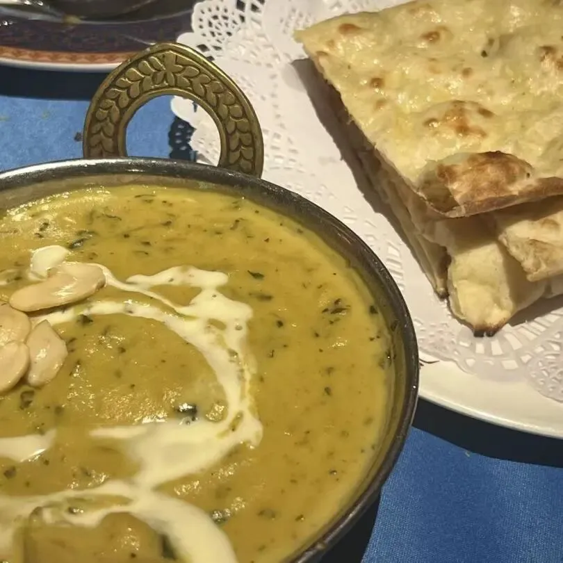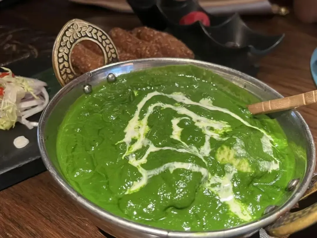 来吃印度菜如果不吃咖喱就像到了北京不去长城一样遗憾。第一次点菠菜芝士咖喱的时候,服务员特地说,不建议点,很多人吃不惯。结果我狠狠点头,那就它了。我爱芝士,也好奇这绿油油的咖喱什么味道。印象中有些奶香,不过毕竟是前几次吃点的,记忆不够深刻了。常规款的咖喱吃多了不妨试试新鲜的?
