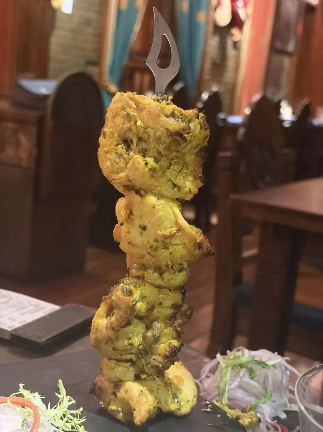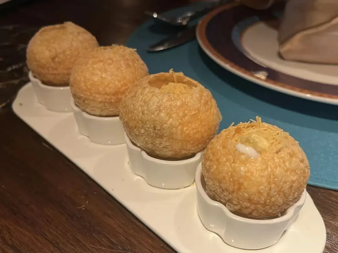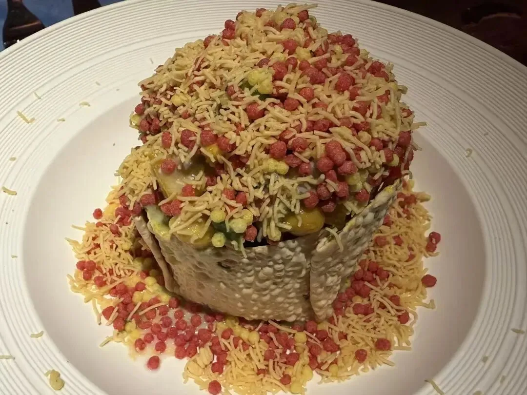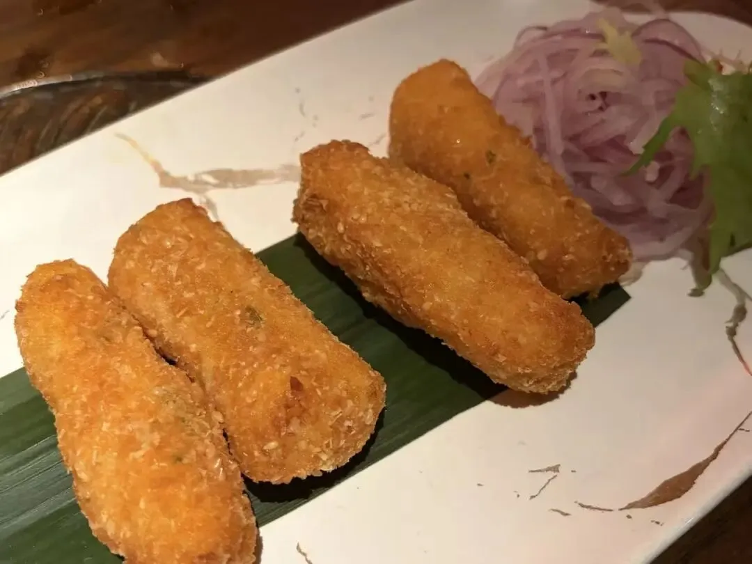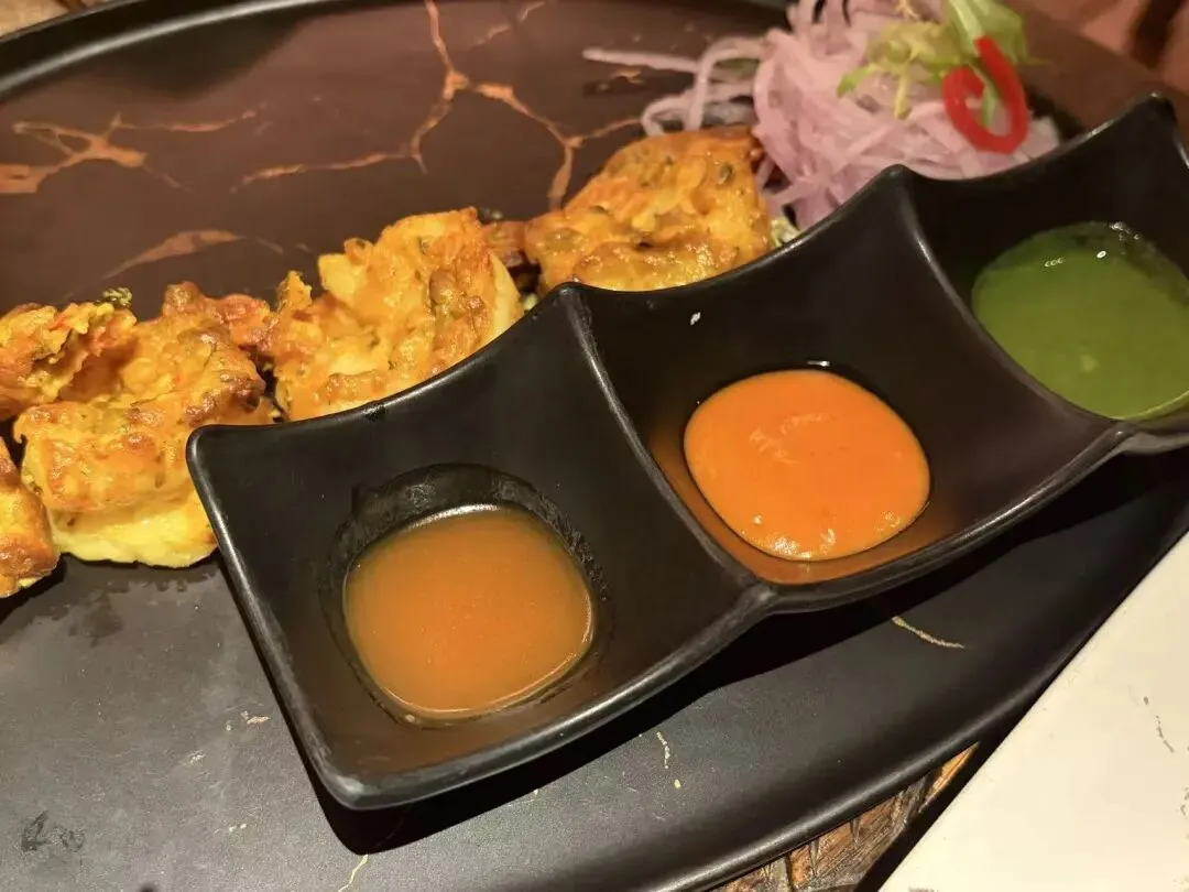 既然提到了玛莎拉球就顺便提一嘴,我也非常爱吃的一道印度国民小吃。空心脆球,里面灌的内陷一般是土豆泥、鹰嘴豆、洋葱之类的,灵魂是绿色的调料——香菜、青柠、罗望子、薄荷、玛莎拉香料等。这样的组合,吃到嘴里,是酥脆、软糯、流淌的水一起创造的感官,酸辣香混合交织。不过这家店里似乎是放的一些酸奶,不过如果没吃过的,请给它一个机会吧!