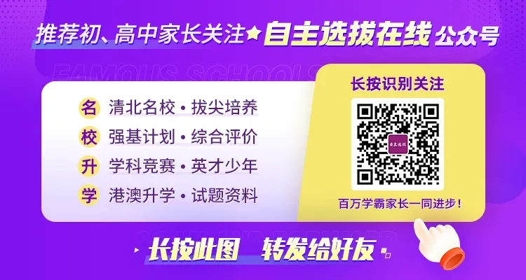 自主选拔在线提供强基、综评、港澳、学科竞赛、少年班、清北、华五等升学政策资讯,助力中学拔尖创新人才培养。欢迎更多初高中家长、师生一起关注我们,圆梦名校!