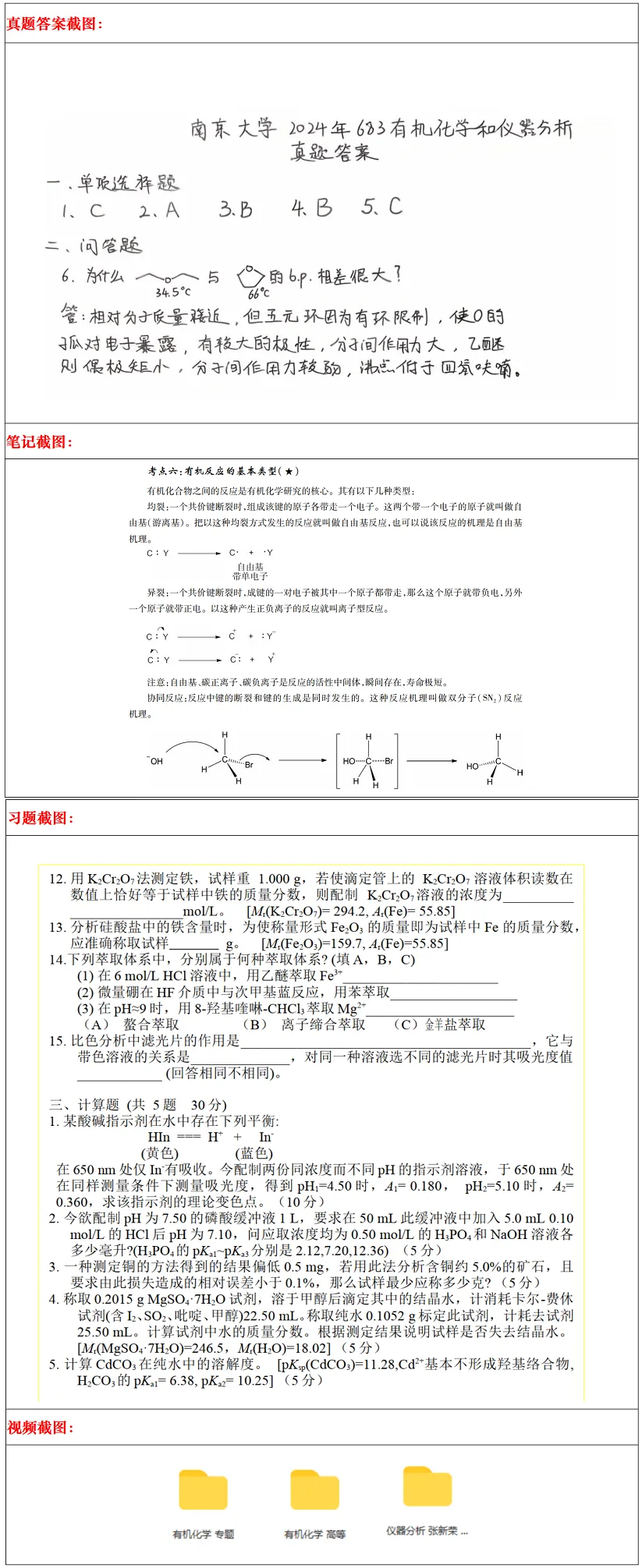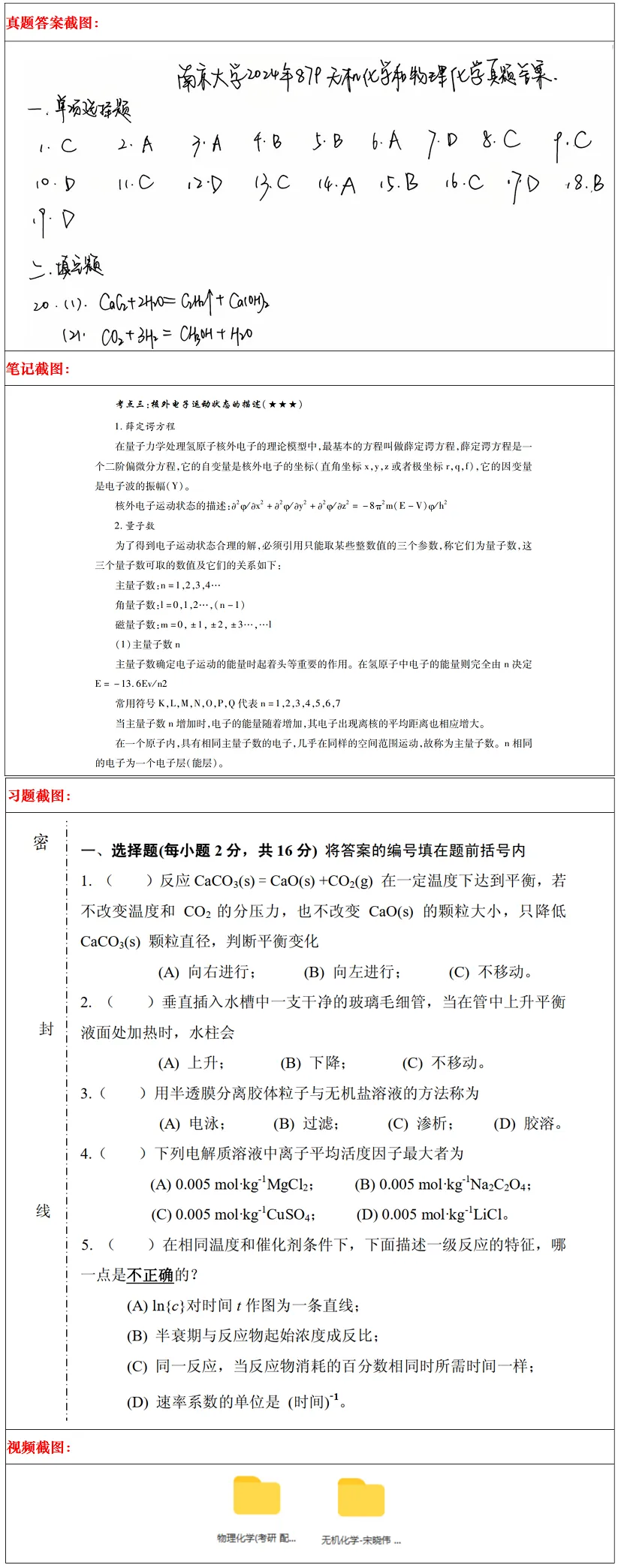 我看的是哈哥网课,觉得讲的还可以,我就看的是老版课程,南大考的不难,我觉得够用了,如果有不放心的可以去买最新课程,也许讲解上有一些变化。物化比较难懂,需要多花点时间,范围基本上是全覆盖的,所以尽量都搞懂,除了一些很难的,适当放弃也行。还有就是考研指导要好好写,多刷几遍。后期要尽量手算吧,我在考场上写一道题算了两张草稿纸,还算错一次。真题也要好好刷,今年考试里面就有很多真题,真题方面可以买小南学姐的,算是比较齐全的了,在某鱼里面找的都不是很全。资料如下:
