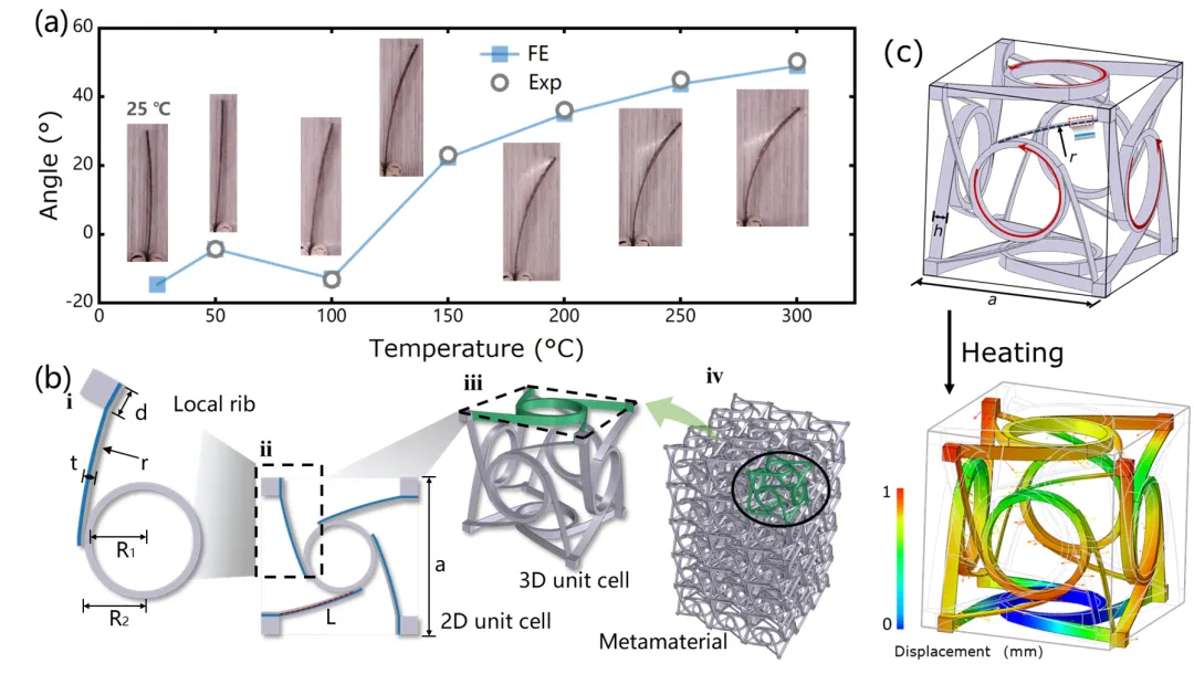图1:三维温度响应超材料设计概念:(a)热双金属材料变形测试;(b)三维超材料设计步骤;(c)热扭转变形示意图