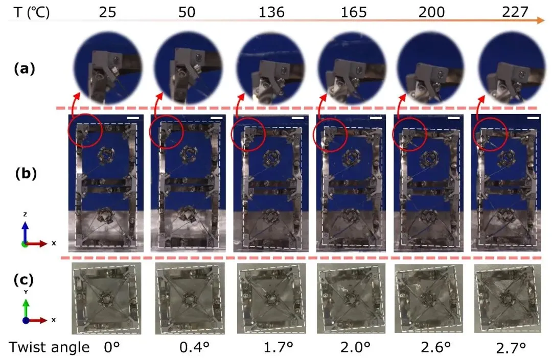 作者们通过装配的方法制备了所提出的超材料结构,并采用油浴加热开展了温度试验,以验证该超材料在升温过程中,是否能够产生扭转或旋转的效应。图2为试验结果,其油浴温度从25℃逐渐增大到227℃。从图2(a)的局部变形图可以发现,该超材料产生了明显的扭转行为。图2(c)记录了该结构俯视下的变形图,并给出了对应的扭转角度。结果表明,该超材料实现了2.7°的角度变化。