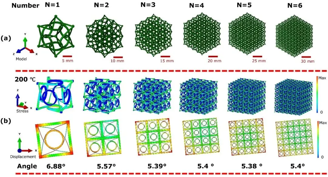 图3:阵列的胞元数量对超材料变形的影响:(a)不同胞元数量的超材料模型;(b)六组超材料在200℃温度增量下的变形。