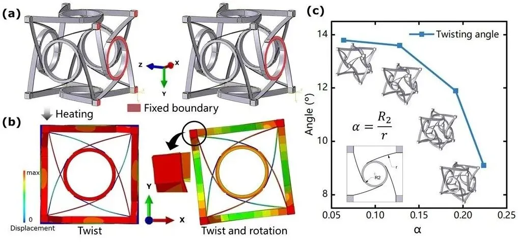 图4:超材料结构变形分析:(a)两种不同边界条件对转动效应的影响;(b)扭转和扭转、旋转的耦合效应;(c)双金属条的相对长度对转动角度的影响。