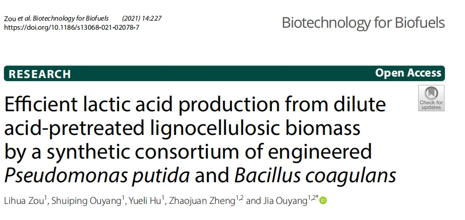 本研究构建了一个合成菌群,用于将高毒性的木质纤维素水解液转化为乳酸。该菌群由工程化恶臭假单胞菌(能够消耗和转化抑制剂,同时保留木质纤维素糖供后续发酵)和凝结芽孢杆菌(能够利用可发酵糖产生乳酸)组成。与不产乳酸的单一培养物对未脱毒水解液的发酵相比,微生物共培养从等滴度水解液中产生了35.8 g/L的乳酸,产率为0.8 g/g总糖。本文的结果证实了使用合成菌群将生物功能分配到特定菌株中以完成单一培养难以完成的复杂任务的潜力。