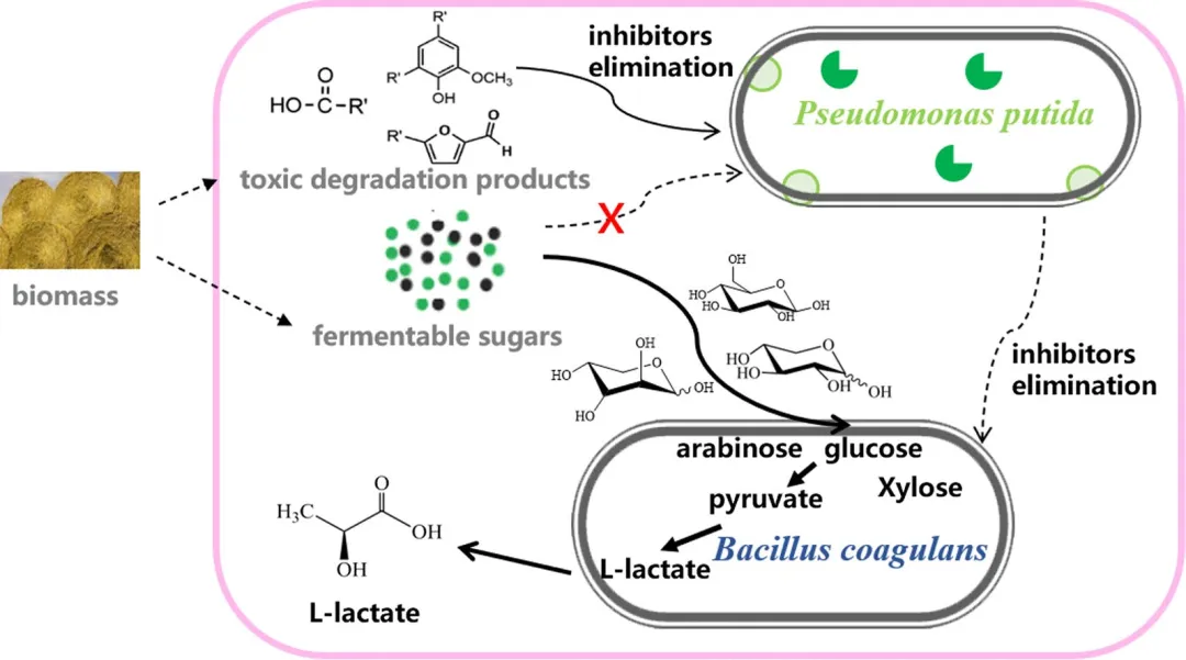 木质纤维素生物质是石油基原料的一种有吸引力的可持续替代品,可用于生产多种生物基化学品,而预处理通常被认为其生物炼制不可或缺的一步。然而,在木质纤维素预处理过程中不可避免地会产生各种抑制剂,这些抑制剂严重阻碍微生物的生长和发酵。目前,很少有报道称存在一种单一的微生物能够对预处理木质纤维素水解液中的毒性混合物进行脱毒或耐受,同时有效地将糖组分转化为有价值的化合物。作为替代方案,微生物共培养通过将代谢功能分配到不同的特化菌株中,为实现这一目标提供了一种更简单、更有效的方法。