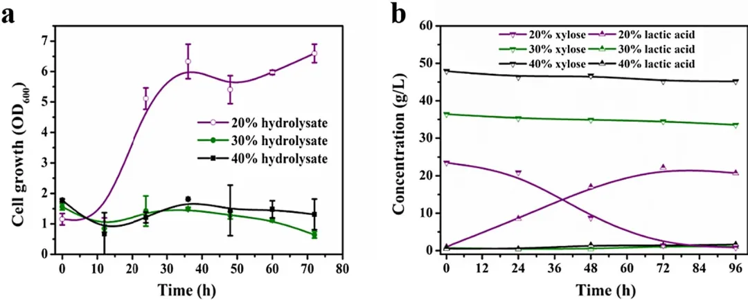 该图展示了单独使用 Bacillus coagulans NL01 对不同浓度(20%、30%、40%)未脱毒玉米秸秆水解液的发酵结果。在 20% 水解液中,菌体能够生长并消耗糖,但存在 12 小时的延滞期;而在 30% 和 40% 水解液中,菌体生长和乳酸发酵几乎完全被抑制。这说明 B. coagulans 对抑制剂的耐受能力有限,无法直接用于高浓度水解液的乳酸生产,必须进行脱毒处理。