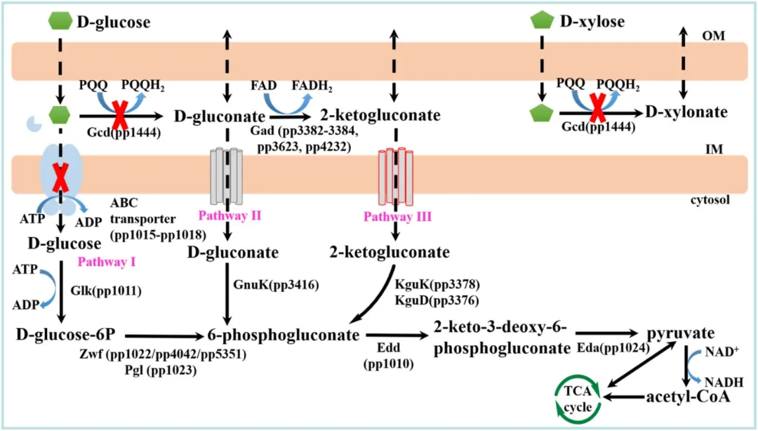 该图展示了 Pseudomonas putida KT2440 中葡萄糖和木糖的代谢路径。葡萄糖通过三条路径最终转化为 6-磷酸葡萄糖酸:一是通过 ABC 转运蛋白(gtsABCD)进入胞内并磷酸化;二是通过周质空间 PQQ 依赖的葡萄糖脱氢酶(Gcd)氧化为葡萄糖酸;三是通过 2-酮葡萄糖酸途径。木糖同样被 Gcd 氧化为木糖酸,但不能作为碳源供菌体生长。该图说明了敲除 gcd 和 gtsABCD 可以有效阻断糖的利用。