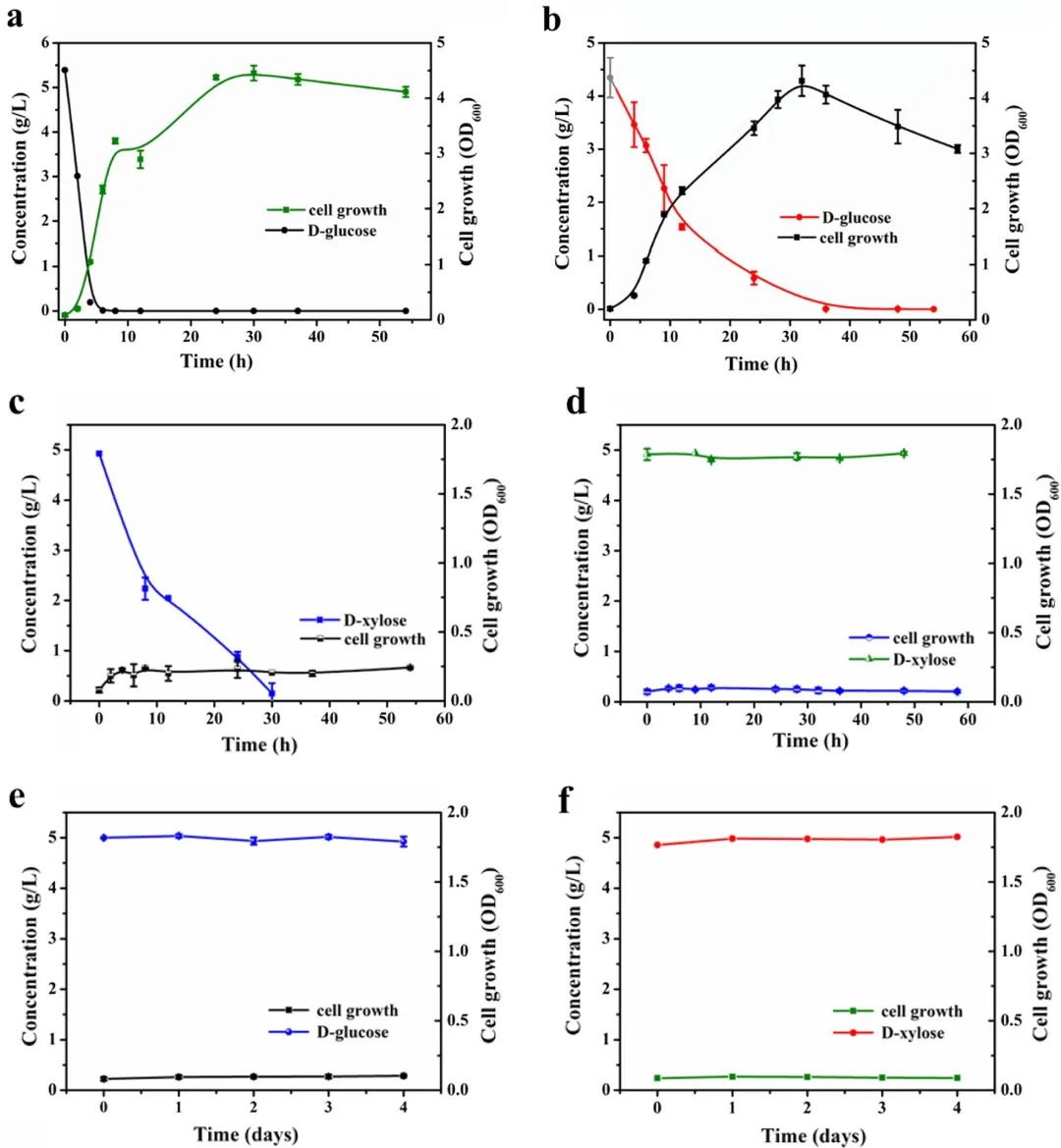 该图比较了野生型和不同敲除菌株在 M9 基本培养基中对葡萄糖和木糖的利用及生长情况。野生型 P. putida 能在 6 小时内消耗完 5 g/L 葡萄糖,OD₆₀₀ 达到 4.5(图 a),但不能利用木糖生长(图 c)。敲除 gcd 后,葡萄糖消耗显著减慢(图 b),木糖不再被消耗(图 d)。同时敲除 gcd 和 gtsABCD 的工程菌在 4 天内完全不能利用葡萄糖或木糖(图 e、f),成功构建了“不消耗可发酵糖”的脱毒菌株。