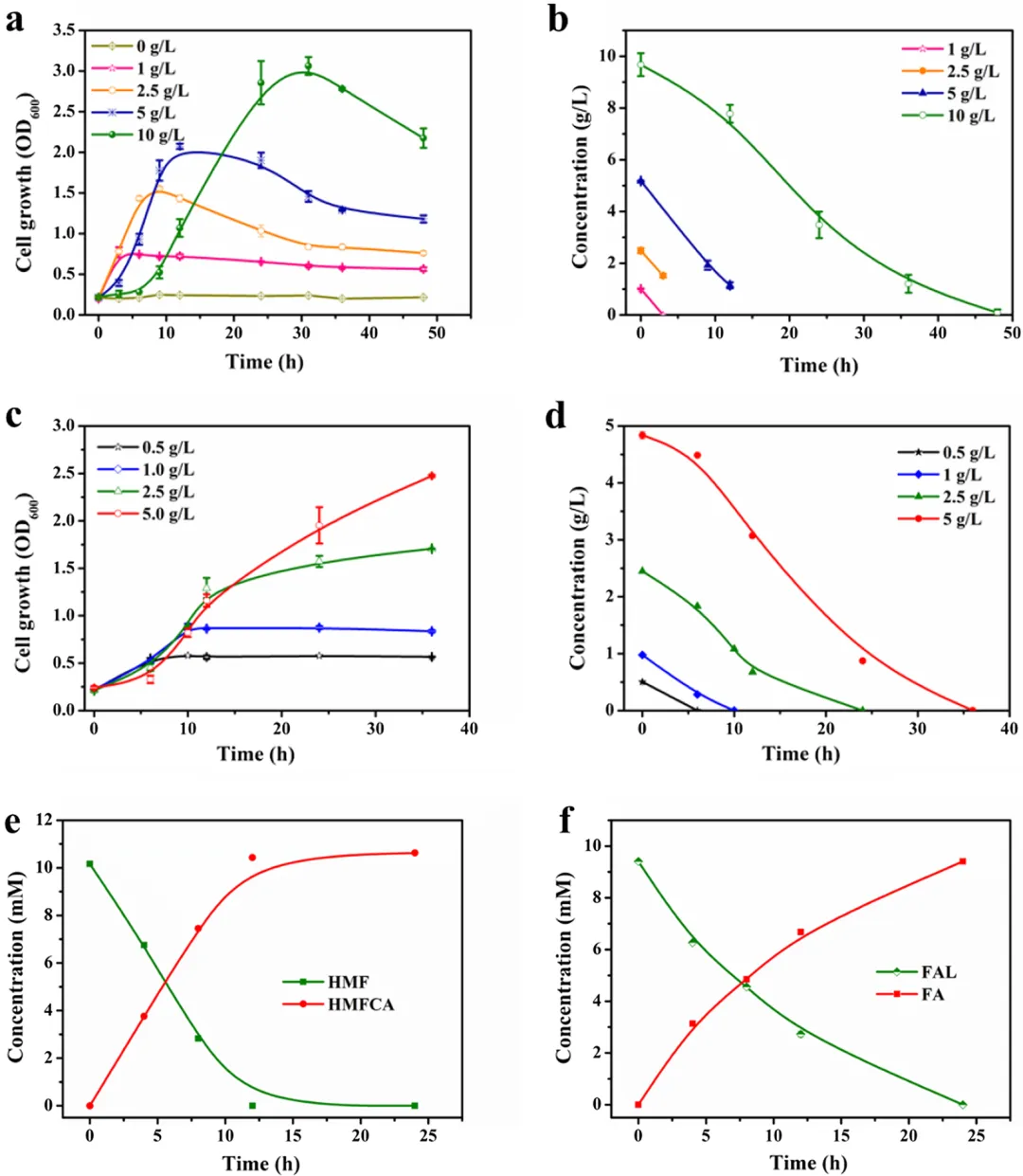 该图测试了工程 P. putida 对有机酸和呋喃类抑制剂的耐受与转化能力。在以乙酸钠为唯一碳源时,菌体在 0–10 g/L 浓度下均能良好生长,且完全消耗乙酸(图 a、b)。对乙酰丙酸(5 g/L)也能快速利用(图 c、d)。对于 HMF 和糠醛(FAL),工程菌能将其分别转化为毒性较低的 HMFCA 和糠酸,其中 HMF 在 12 小时内完全转化,FAL 在 24 小时内完全转化(图 e、f)。表明该菌对常见抑制剂具有高效降解能力。