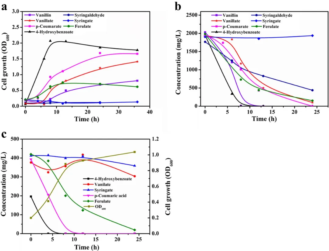 该图展示了工程 P. putida 对多种酚类化合物的代谢能力。以约 2 g/L 的单一酚类(如阿魏酸、对香豆酸、4-羟基苯甲酸、香草醛等)为碳源时,菌体能良好生长并快速消耗这些化合物(图 a、b)。对于香草醛和丁香醛,菌体先将其转化为香草酸或丁香酸,香草酸可被进一步利用,而丁香酸不能作为碳源。在混合五种酚酸时,菌体几乎同时消耗它们(图 c)。说明工程菌具有广谱的酚类降解能力。
