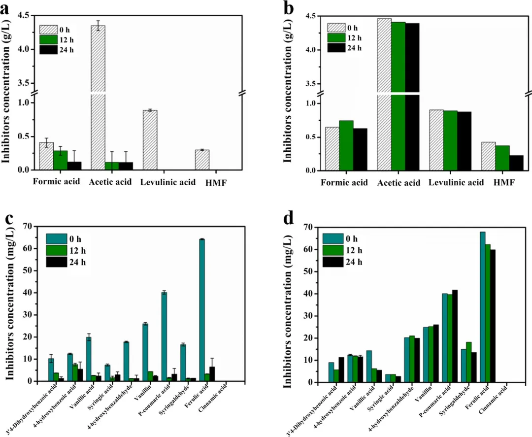 该图比较了 30%(v/v)未脱毒玉米秸秆水解液在有无工程 P. putida 处理下抑制剂的变化。有脱毒菌存在时(图 a、c),乙酸和乙酰丙酸在 12 小时内完全降解,HMF 完全转化,总酚含量下降 25%,典型酚类(如阿魏酸、对香豆酸、香草醛、丁香醛等)浓度显著降低。而无脱毒菌的对照组(图 b、d)中,各类抑制剂浓度基本保持不变。证明工程 P. putida 能够在不消耗糖的前提下有效脱除水解液中的多种抑制剂。
