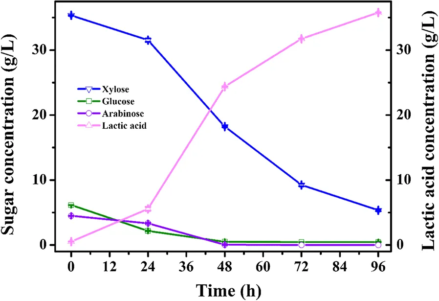 通过微生物发酵从可再生资源生产的生物基化学品,由于化石燃料的枯竭及相关的环境问题,正迅速引起人们的关注[1]。在这些生物基化学品中,乳酸及其衍生物作为日益重要的平台化合物,在食品和化学工业中具有广泛的应用[2]。目前,乳酸的生物法生产技术已非常成熟。然而,传统底物的成本限制了其在聚乳酸作为石油基塑料绿色替代品的大规模开发中的应用[3]。木质纤维素生物质主要由纤维素、半纤维素和木质素组成,是地球上最丰富、廉价的可再生碳源[4]。实现从木质纤维素来源的糖到乳酸的有效生物转化具有重要意义。然而,由于其顽抗性和不规则的键合结构,很少有微生物能直接利用木质纤维素生产目标产物[5]。因此,预处理对于提高木质纤维素的可消化性并释放更多可发酵糖以供微生物发酵是必不可少的[6]。然而,许多预处理研究表明,在木质纤维素解构过程中不可避免地会形成各种严重阻碍微生物生长和发酵的抑制剂,主要是有机酸、呋喃衍生物和酚类化合物[7]。这些抑制剂构成了有效利用木质纤维素糖和有效生产生物基化学品的严重障碍。因此,开发低成本的方法和微生物来克服生物质发酵中抑制剂的障碍,将有助于木质纤维素生物炼制的规模化和商业化。