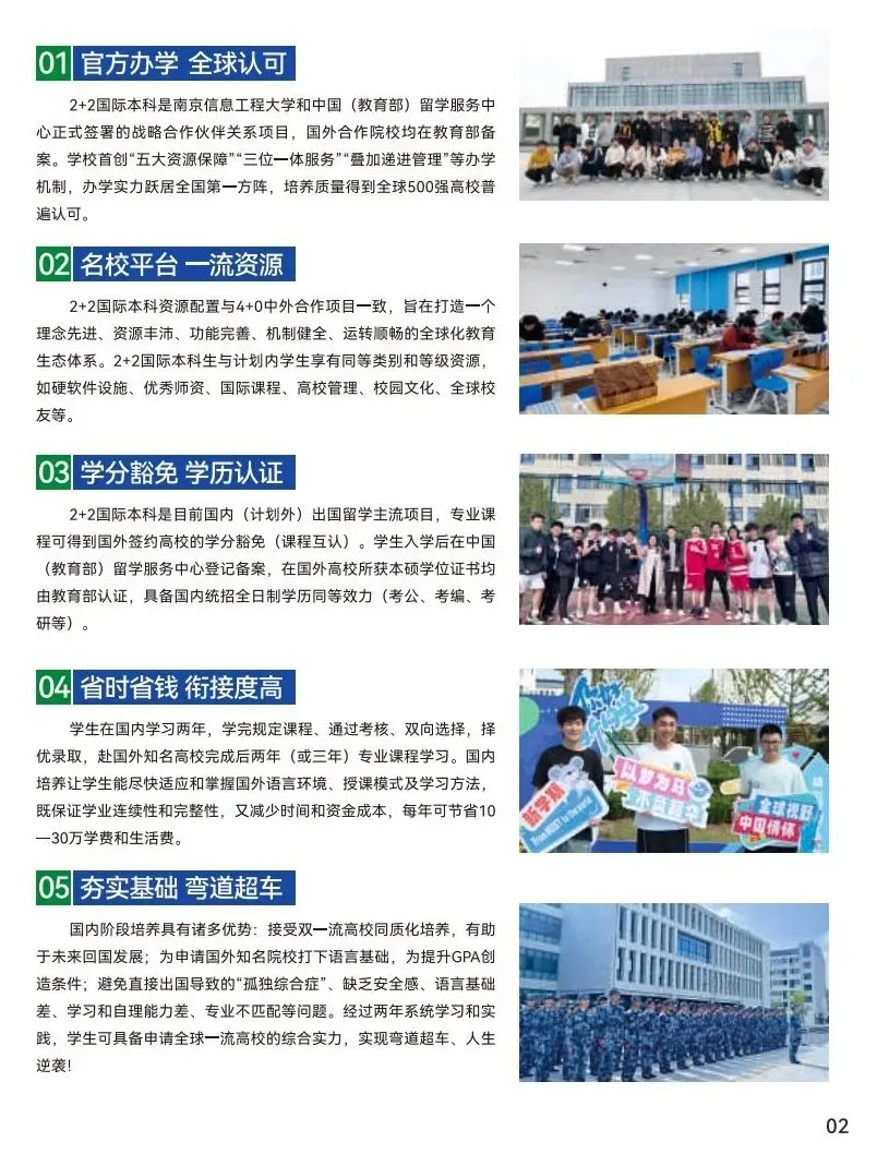 2+2国际本科是南京信息工程大学和教育部(中国)留学服务中心正式签署的战略合作伙伴关系项目,是目前国内(计划外)出国留学主流项目。该项目学制设置科学合理,克服了直接出国留学的诸多弊端。