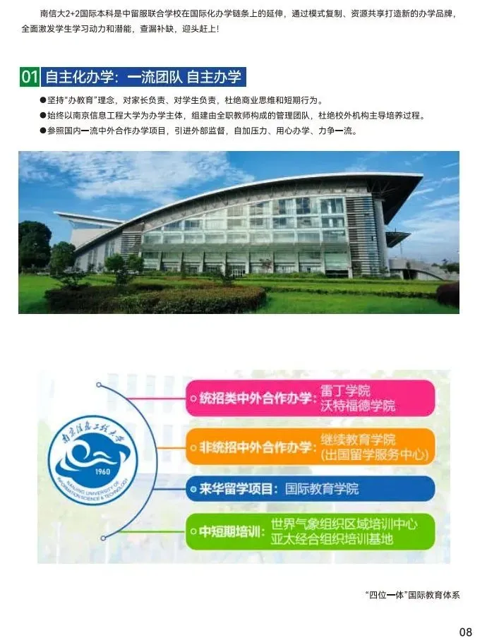 南信大2+2国际本科是4+0国际本科在国际化办学链条上的延伸,通过模式复制、资源共享打造新的品牌,形成计划内、计划外全覆盖。鉴于4+0国际本科的成功,南信大有足够信心、实力和资源办好2+2国际本科。