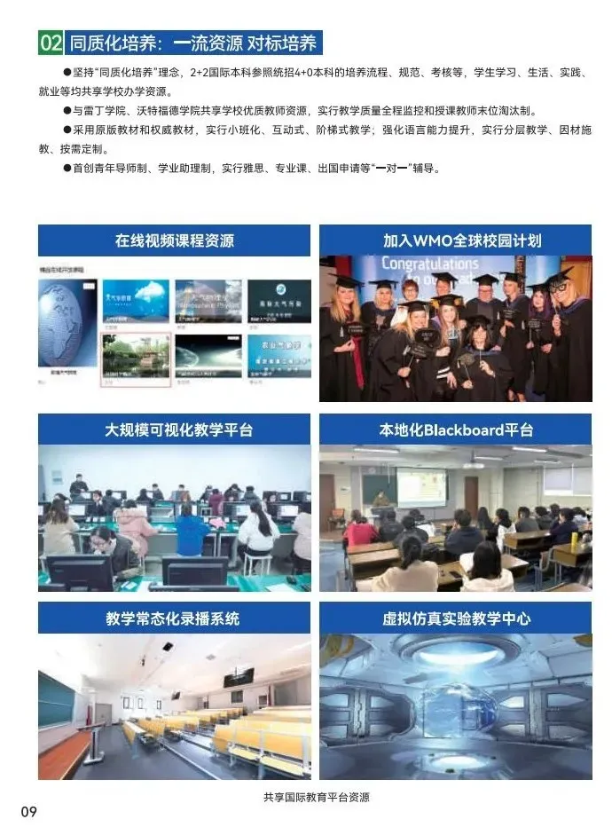 ● 坚持“同质化培养”理念,2+2国际本科与统招4+0本科的培养流程、规范、考核等完全一致,学生学习、生活、实践、就业等均共享学校办学资源。