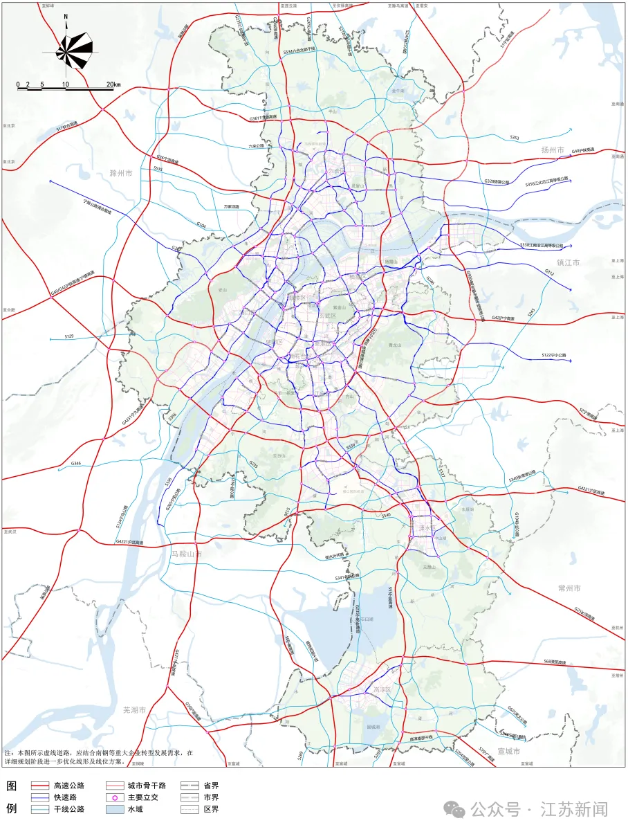 打造“井字三环、轴向放射、组团快联”的高快速路网格局,让全城出行更顺畅。“井字”是绕城公路以内,东西、南北各两条快速路组成的井字形路网;“三环”是绕城公路环、南京绕城高速公路环,以及南京都市圈环线高速公路;“轴向放射”是沿着城镇发展轴带,铺开高速公路和快速路;“组团快联”则是在相邻城区片区、组团之间,修建快速路连接线,打通片区阻隔,实现市域全域高效联通。