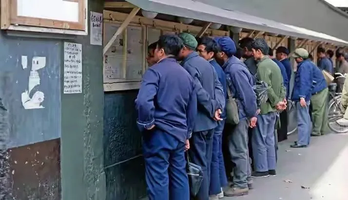 这排队的架势,现在都难见到了,图里一水的蓝色工作服和解放帽,手后背着,脑袋探过去看玻璃窗里贴着的一张张报纸,里面全是大事小情,左边写着通知,右边贴着社论,大人小孩一块儿凑热闹,早年头手机没有,家里电视还没普及,看报就是一天的头号大事。