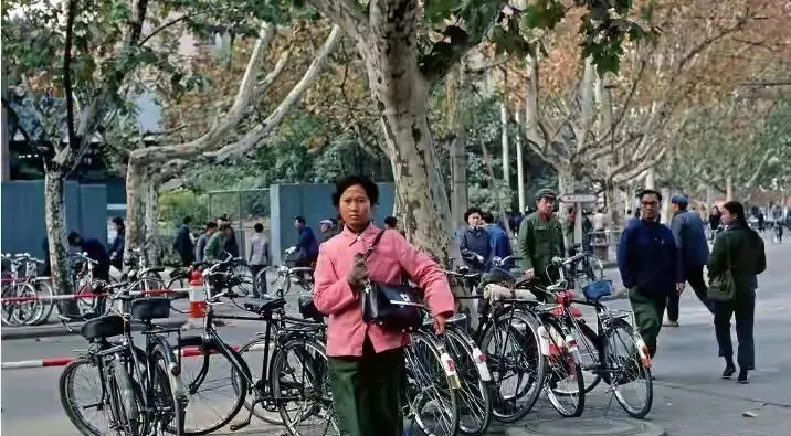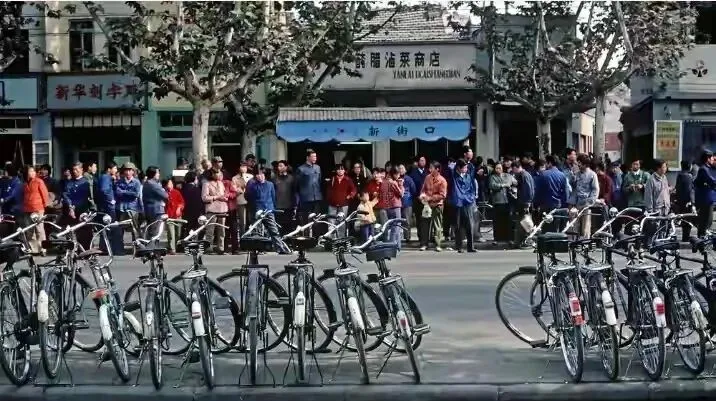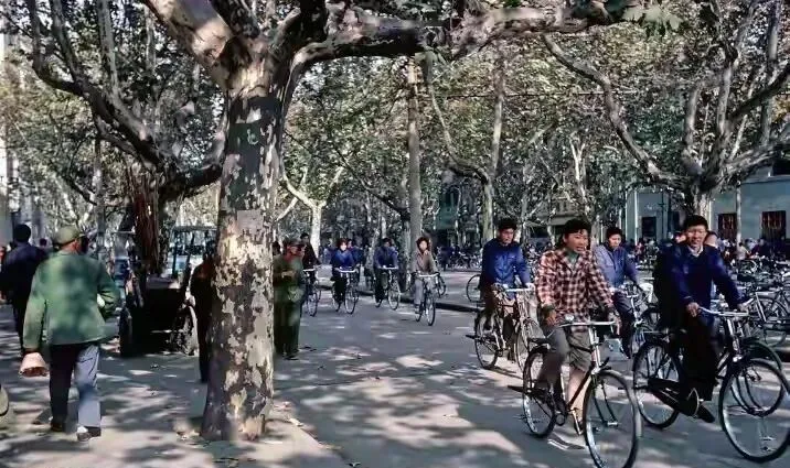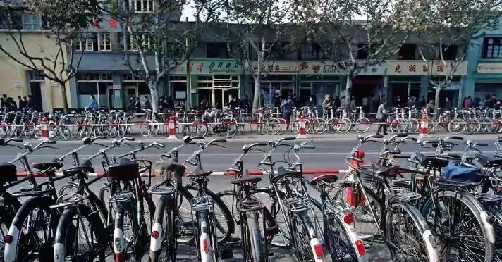 南京的二八大杠那会排满了马路两边,图中这堆车,前后排得整齐,黑漆漆全是钢铁家伙,铃铛一晃响个不停,想借一辆骑得先问清楚,“谁家的呀,锁呢”,上学的大人上班的孩子下课,全靠两条腿和一车轮,二八牌凤凰、永久、飞鸽,踏板磨得油亮亮。