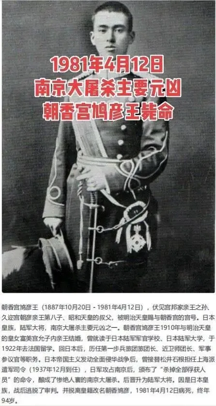 1981年4月12日,南京大屠杀主要元凶朝香宫鸠彦王毙命