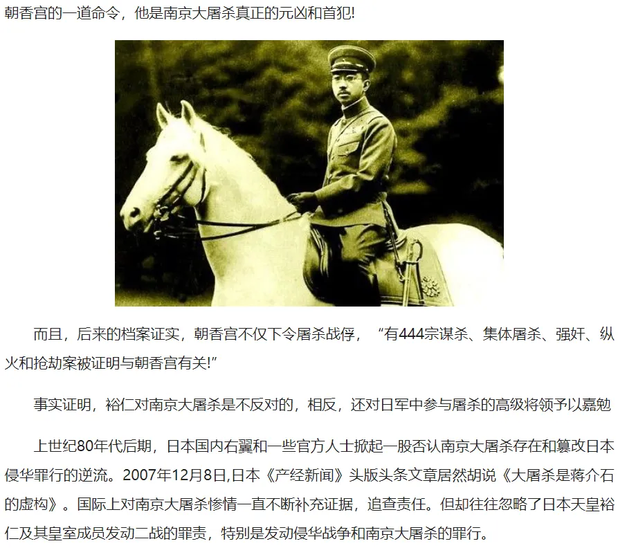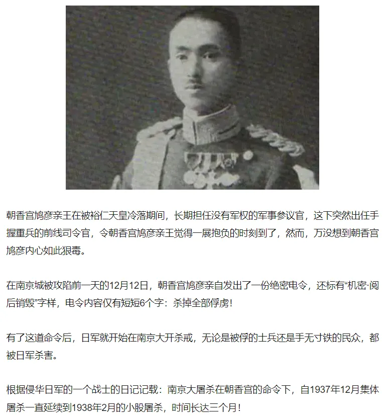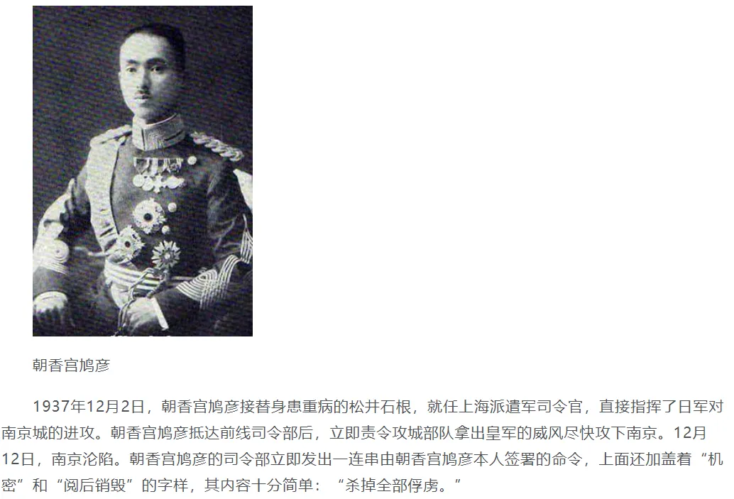 南京大屠杀有三个元凶,第一个是亲手颁布“杀掉全部俘获人员”命令的朝香宫鸠彦王;