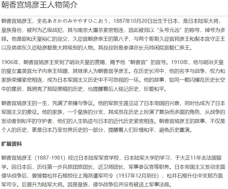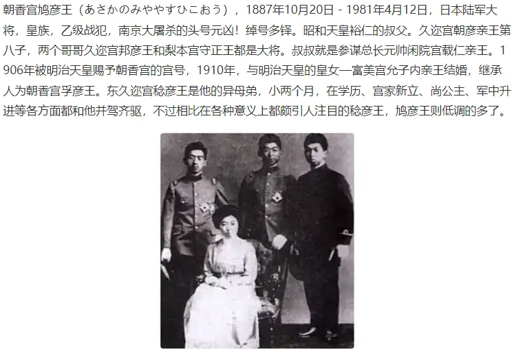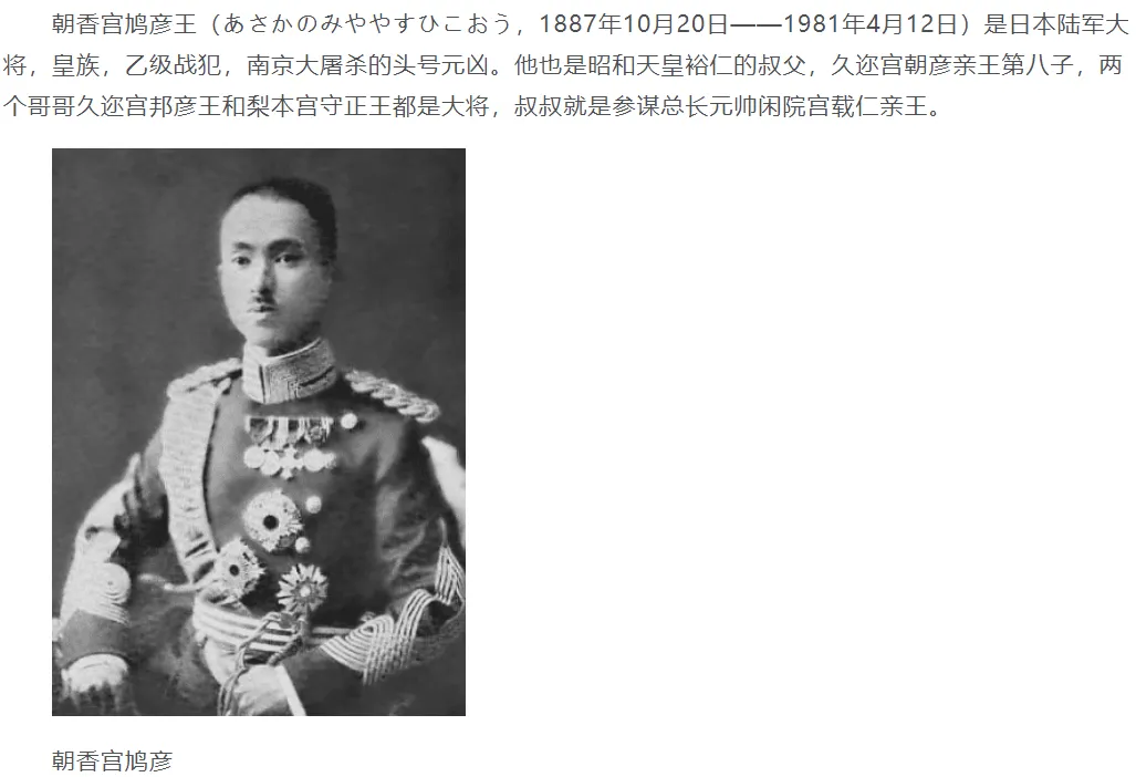 【朝香宫鸠彦王,1887年10月20日,出生于日本东京。1981年4月12日,在静冈县热海毙命。昭和天皇的姑父,陆军大将,日本发动全面侵华战争后,担任上海派遣军司令,南京大屠杀主要元凶之一。因是皇族,战后逃脱了审判,脱离皇籍改名朝香鸠彦。】