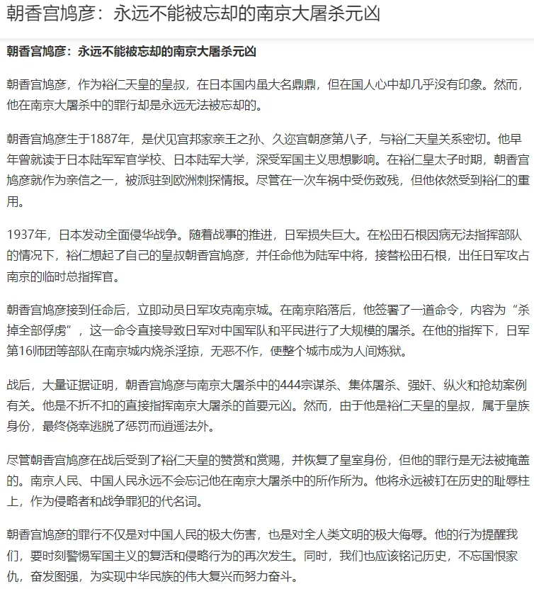 日本裕仁天皇对朝香宫鸠彦在南京的行动异常的“满意”,并专门发来贺电:“战绩卓著,史无前例。”而他留给国人的伤害才真正是史无前例的。