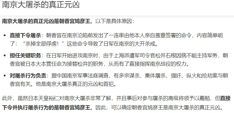 因为是朝香宫鸠彦鸠彦亲自指挥了这一场有意识、有指导的屠杀行动,所以说他才是南京大屠杀的第一元凶、真正的罪魁祸首。
