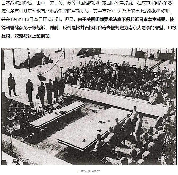 日本投降后,松井石根经远东国际军事法庭审判被押上了绞刑架,谷寿夫被引渡回中国在雨花台枪毙,还有一些人被判刑。但法庭仅对南京大屠杀事件主要责任人之一朝香宫鸠彦王做了走走形式的盘问,没有进行审判。