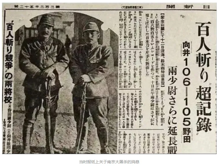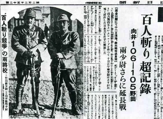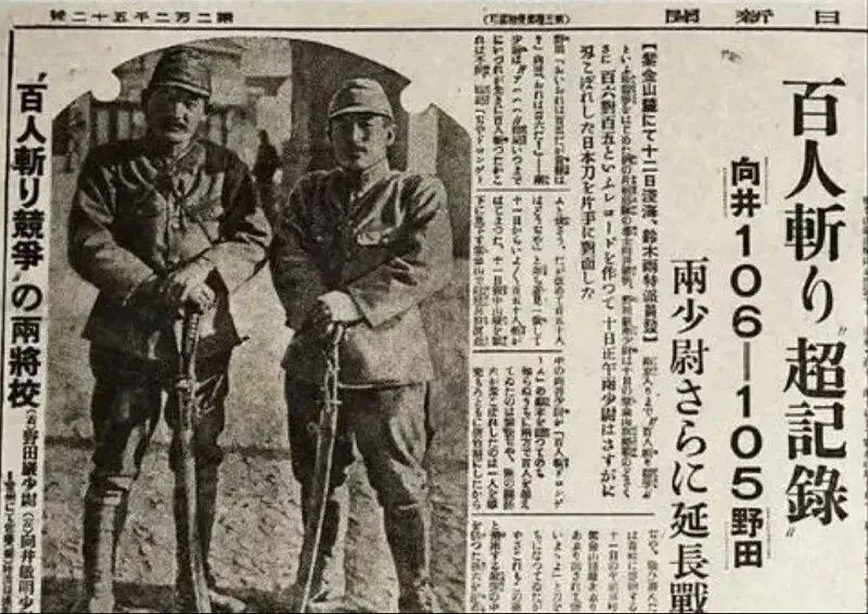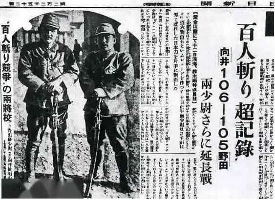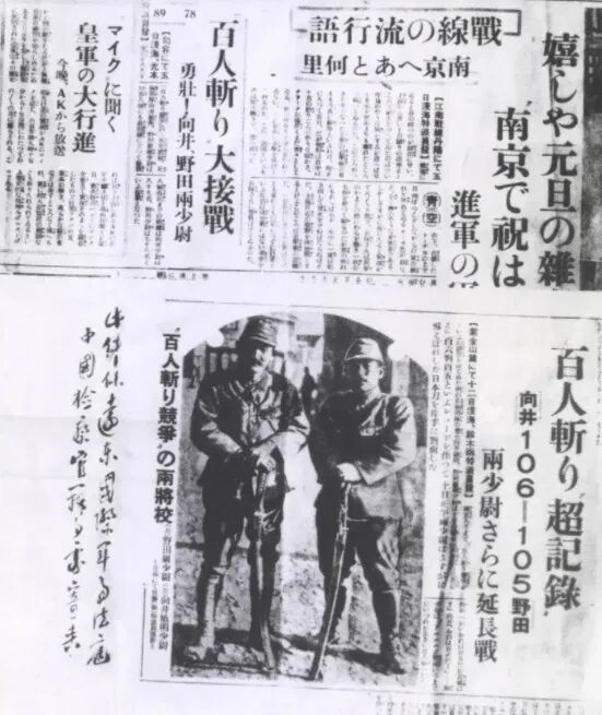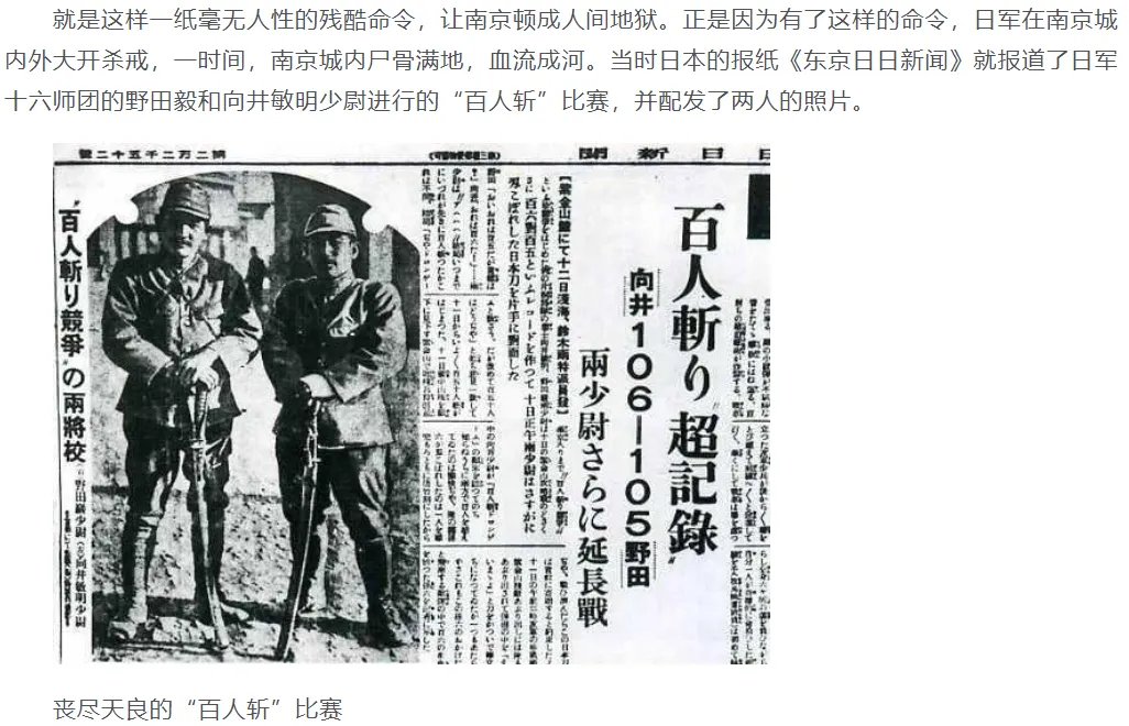 就是这样一纸毫无人性的残酷命令,让南京顿成人间地狱。正是因为有了这样的命令,日军在南京城内外大开杀戒,一时间,南京城内尸骨满地,血流成河。当时日本的报纸《东京日日新闻》就报道了日军十六师团的野田毅和向井敏明少尉进行的“百人斩”比赛,并配发了两人的照片。