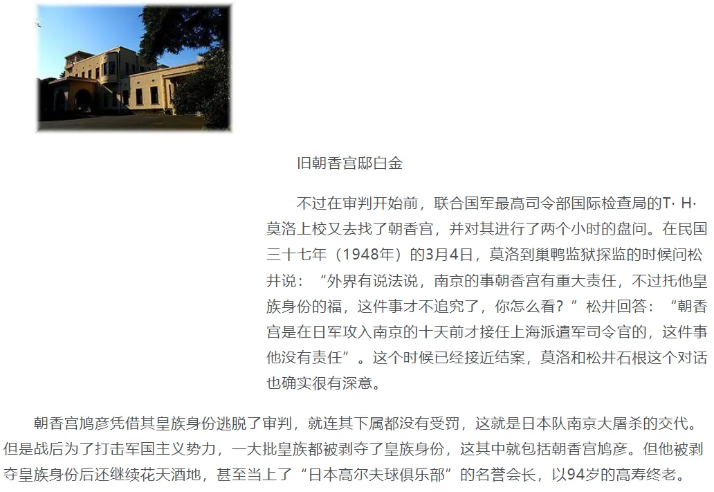 值得一提的是,1948年三月四日莫洛上校到巢鸭探监时,问松井说:“外界有说法说,南京的事朝香宫有重大责任,不过托他皇族身份的福,这件事才不追究了,你怎么看?”