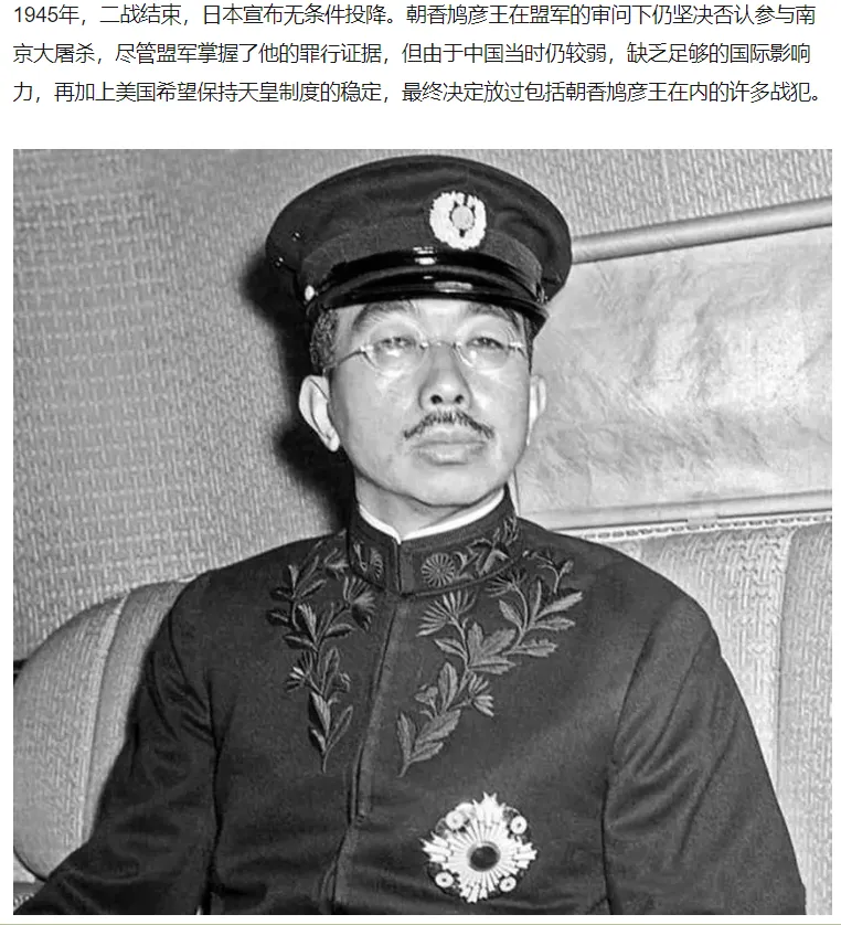 二战后,朝香宫鸠彦王也被认为是南京大屠杀的主要元凶,但是由于自己是日本皇族,他逃过了战后的审判,直到1981年因病去世。