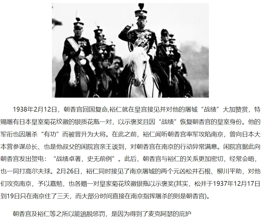 1937年12月14日,为勉励攻占南京的日军,裕仁天皇面谕:“中国方面陆海军各部队,在上海附近作战持续勇猛果断,乘胜追击,使(中国)首都南京陷落,我很满意。此旨传达给全体将士们。”朝香宫鸠彦王迎来了人生的“辉煌”。