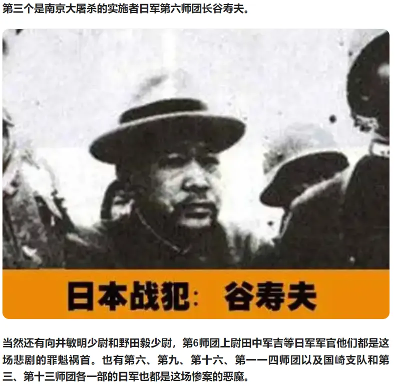 第三个是南京大屠杀的实施者——日军第六师团长谷寿夫。正是这三个大元凶,才酿成了南京大屠杀这样惨绝人寰的人间悲剧。