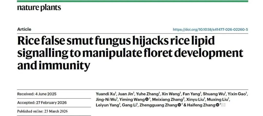 2026年3月23日,南京农业大学植物保护学院张正光教授团队在国际权威学术期刊《Nature Plants》在线发表题为“Rice false smut fungus hijacks rice lipid signaling to manipulate floret development and immunity”的研究论文,该研究揭示了稻曲病菌通过分泌效应蛋白“劫持”水稻脂质信号操控小花发育和免疫的精妙机制,不仅为理解植物生殖发育与免疫的交叉对话提供了全新视角,更为稻曲病的绿色防控提供了重要的理论基础和潜在靶标。