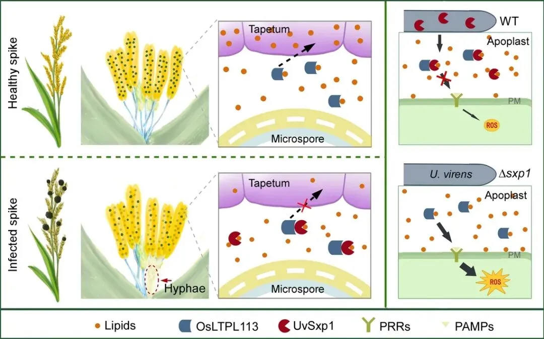 研究团队鉴定到一个关键质外体效应蛋白Sxp1,该蛋白在富营养环境及侵染早期被诱导表达分泌,在水稻中异源表达导致花粉活力下降和小穗不育,其敲除突变体致病力显著下降且不能抑制寄主免疫。进一步研究发现,Sxp1直接靶向水稻脂质转移蛋白LTPL113,该蛋白能够结合磷脂酸(PA)和磷脂酰丝氨酸(PS),对花粉发育和脂质介导的免疫反应均至关重要。Sxp1通过与LTPL113互作,精准破坏其与脂质的结合,从而同时阻断花粉外壁发育所需的脂质转运和免疫信号输出,实现“一箭双雕”的致病策略。