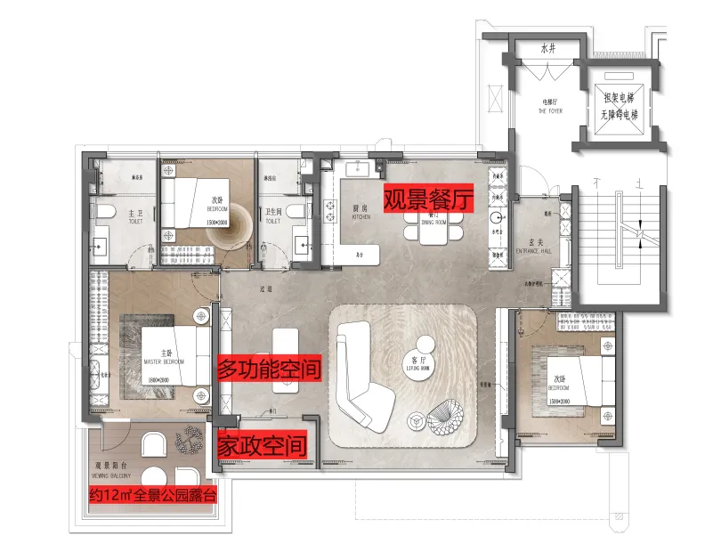 双开门电梯,营造出一梯一户的私密。全明独立电梯厅,业主踏出电梯就能瞧见窗外的秦淮河与公园。