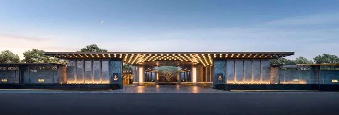 长约百米、高约7米的恢弘门廊,以蓝翡翠奢石做景墙,弧形切割的爱马仕灰大理石做立柱,搭配环岛落客区前的百年金桂,达成雅与奢的平衡。