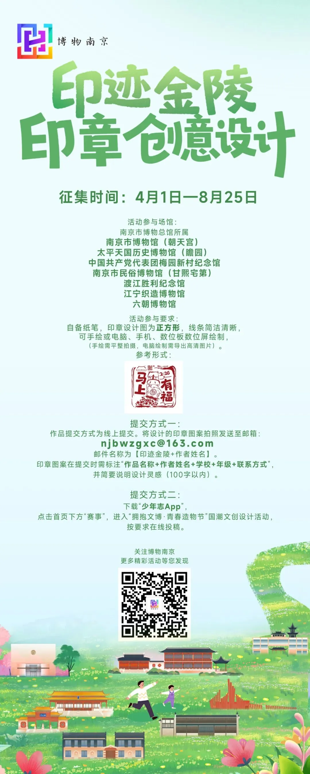 信息:邮件名称为【印迹金陵+作者姓名】。印章图案在提交时需标注“作品名称+作者姓名+学校+年级+联系方式”,并简要说明设计灵感(100字以内)。