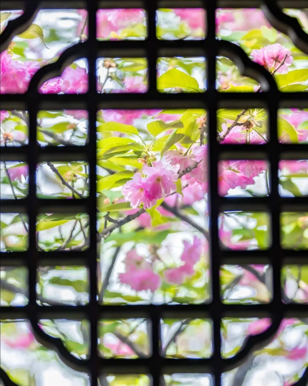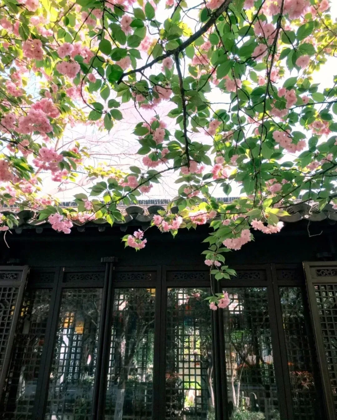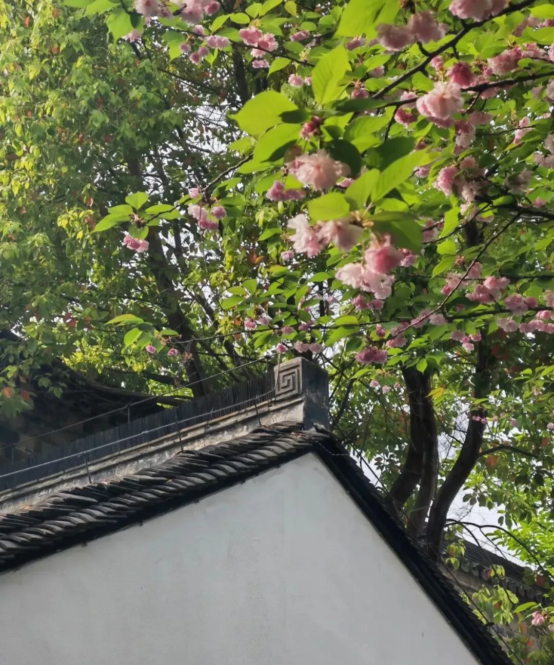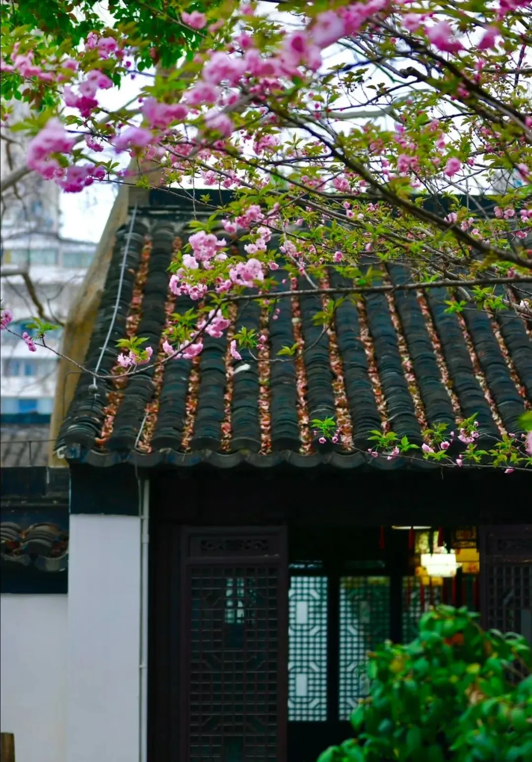 粉白的花瓣层层叠叠,缀满枝头,与黝黑的黛瓦、素净的白墙、精巧的花窗相映成趣 。
