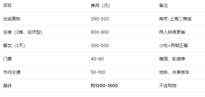 小提醒: 第二天建议退房后寄存行李在酒店或火车站(虹桥站有自助寄存柜,小箱20元/天)。回程票最好买下午4-5点的,这样不赶。
