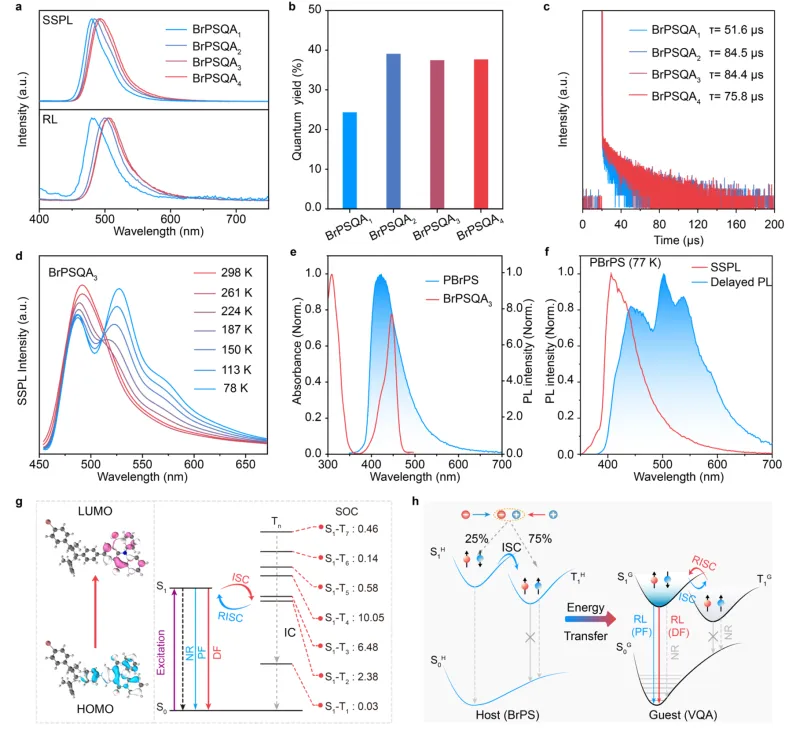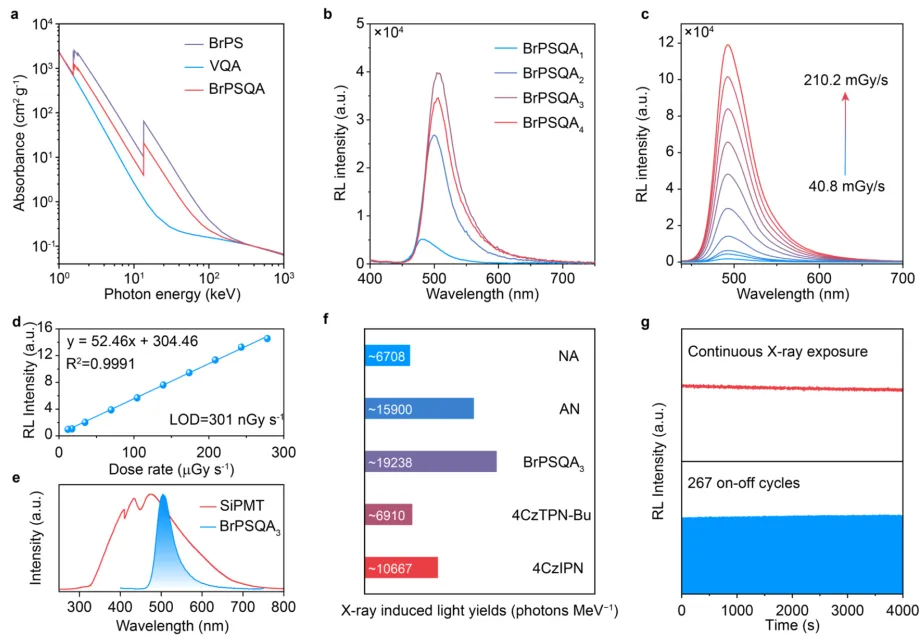 图1:多共振热活化延迟荧光 (MR-TADF) 共聚物闪烁体的示意图。(a) 通过将 MR-TADF 发色团客体整合至 X 射线敏化主体中的 MR-TADF 共聚物闪烁体设计策略。(b) 硅光电倍增管 (SiPMT) 探测器的量子效率与典型 MR-TADF 闪烁体的发射特性。(c) BrPSQAx 的分子结构 (左) 以及 X 射线诱导闪烁过程的辐射发光(RL) 与能量转移 (ET) 机制 (右)。在 X 射线激发下,重溴 (Br) 原子主要吸收高能光子,产生大量高能初级电子。经热化过程后,电子−空穴对在 BrPS 主体内有效复合,以统计比例 1:3 形成单线态与三线态激子态。激发能量由 BrPS 主体传递至 VQA 客体,从而产生以 MR-TADF 为主导的辐射发光。图2:MR-TADF共聚物闪烁体在环境条件下的闪烁性能。(a) BrPSQA、BrPS和VQA的模拟X射线吸收谱。(b) BrPSQAx (x = 1−4) 的辐射发光光谱。(c, d) BrPSQA3在不同辐射剂量率下的辐射发光光谱 (c) 与强度 (d)。检测限采用3σ/斜率法计算。(e) 未经校正的硅光电倍增管光谱响应曲线与BrPSQA3的辐射发光光谱。(f) 相同激发条件下,萘、蒽、2,3,5,6-四(3,6-二叔丁基咔唑-9-基)-1,4-二氰基苯、1,2,3,5-四(咔唑-9-基)-4,6-二氰基苯、2,4,5,6-四(9H-咔唑-9-基)间苯二甲腈以及BrPSQA3粉末的计算X射线诱导光产额对比。(g) 在210.2 mGy/s剂量率下连续X射线辐照4000秒及267次重复开关辐照循环过程中500 nm处辐射发光强度的稳定性。图3:MR-TADF共聚物的光物理性质与理论计算。(a) 归一化稳态光致发光光谱(上) 与辐射发光光谱 (下)。(b) 330 nm紫外光激发下的光致发光量子产率。(c) 延迟荧光寿命曲线。(d) BrPSQA3在78至298 K温度范围内的变温稳态光致发光光谱。(e) PBrPS的稳态光致发光光谱与BrPSQA3的吸收光谱。(f) PBrPS在77 K下的稳态光致发光光谱及延迟光致发光光谱 (延迟时间10 ms)。(g) BrPSQA的最高占据分子轨道与最低未占分子轨道分布,以及相应的能级与自旋轨道耦合常数。PF:瞬时荧光;DF:延迟荧光;IC:系间窜越;NR:非辐射衰减。(h) X射线激发下可能的辐射发光发射机制。需注意,为清晰展示辐射发光发射过程,图中省略了非辐射过程。图4:X射线成像应用。(a) BrPSQA3掺杂聚砜闪烁体薄膜的制备流程。(b) 自行搭建的X射线成像装置示意图。(c) 所制备闪烁体薄膜在日光与紫外光照射下的照片。(d) BrPSQA3掺杂聚砜薄膜的辐射发光光谱。(e) 由闪烁屏获取的X射线图像对应的调制传递函数曲线。(f) 标准X射线测试图案板、封装金属螺丝、鱼体内注射器针头以及电子芯片的明场照片与X射线图像。比例尺为0.5 cm。